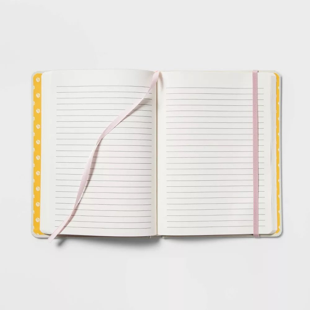 Add beautiful blooms to your assortment of school and office supplies with this College-Ruled Journal. This hardcover notebook has 240 double-sided, ruled pages for taking notes, making lists and more, along with a light pink ribbon bookmark and matching elastic band. Your daily note-taking is given a lively pop of color by the vibrant floral-print cover on a cream-colored background, which is elevated by the gold glitter heading that says “Notebook” on the front. Plus, the compact size makes it easy to carry around.