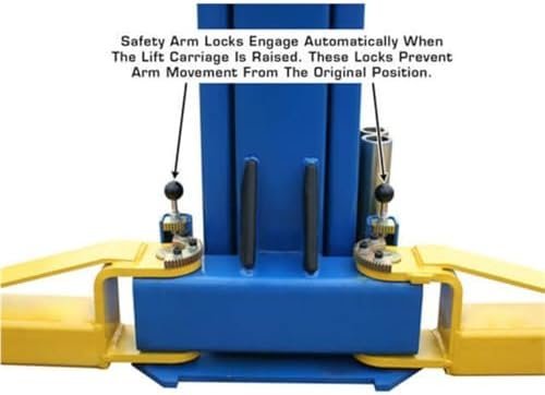 SAFETY-FIRST FEATURES: Automatic arm restraints and a single-point lock release enhance user safety, while rubber guards protect vehicles during lifting operations. The lift is designed to meet high commercial safety standards