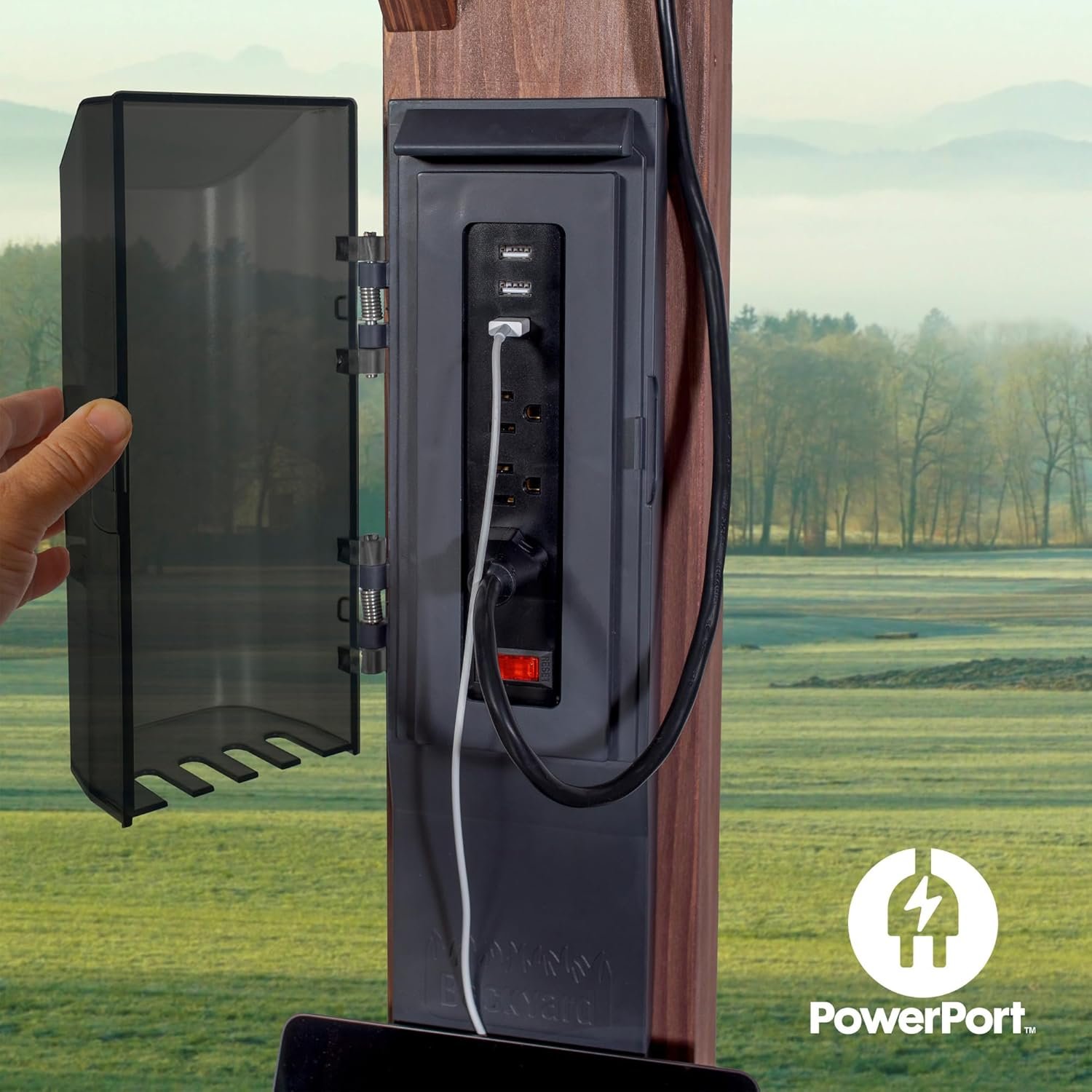 POWERED UP: Exclusive removable PowerPort features 3 electrical outlets and 3 USB ports that is transferable to any post on the structure. PowerPort can be used for charging devices, lights and more. PowerPort requires a power source to be functional (not included)
