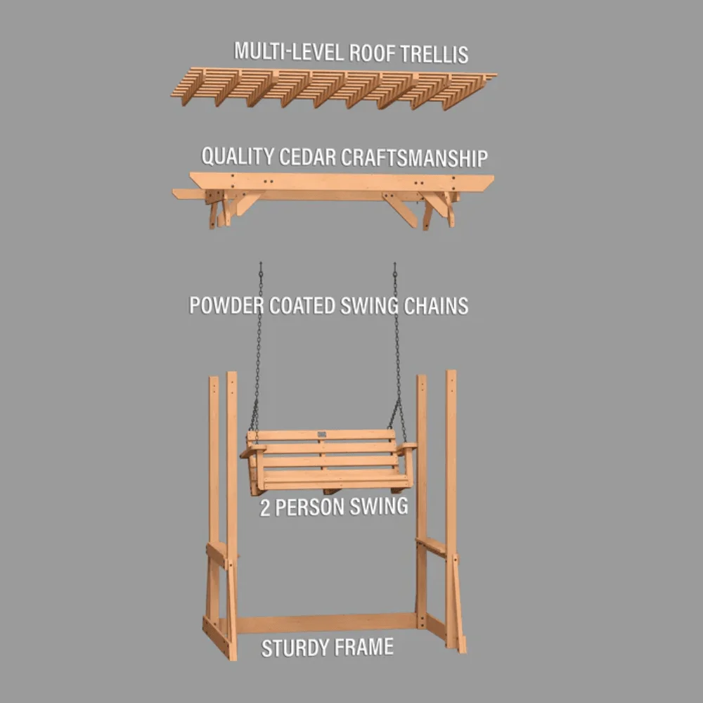 Crafted from 100% durable cedar wood, this classic pergola swing blends timeless aesthetics with superior strength. Featuring pre-cut and pre-drilled lumber for easy assembly, you can enjoy relaxation without the hassle. With a 600 lbs. weight capacity, this two-person swing provides a sturdy and serene way to unwind for years to come.