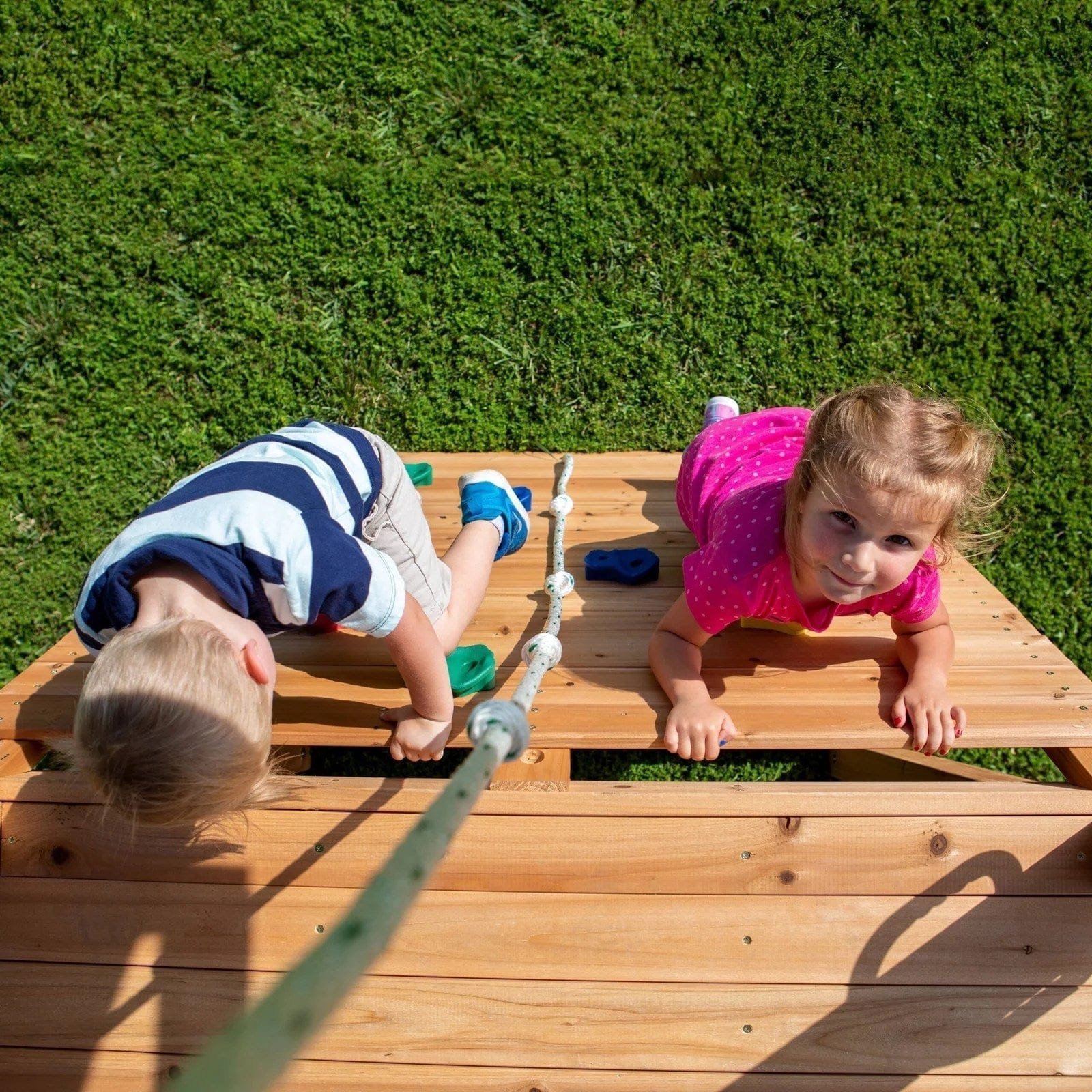 Full width, double rock wall with climbing rope offers a much larger climbing structure that can allow 1 or 2 children to use at the same time.
