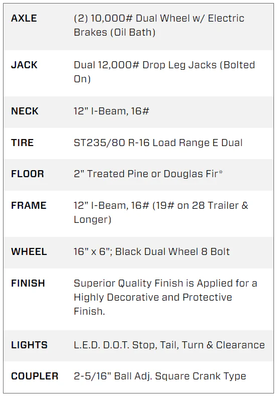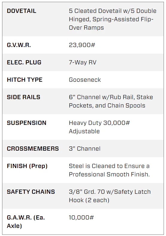 With a 35 ft deck and 5 ft Mega Ramps, it delivers maximum loading flexibility. The trailer’s dual-wheel tandem axles provide outstanding load capacity, while its pierced-beam frame design enhances strength and lowers the deck height for smoother loading and better stability.