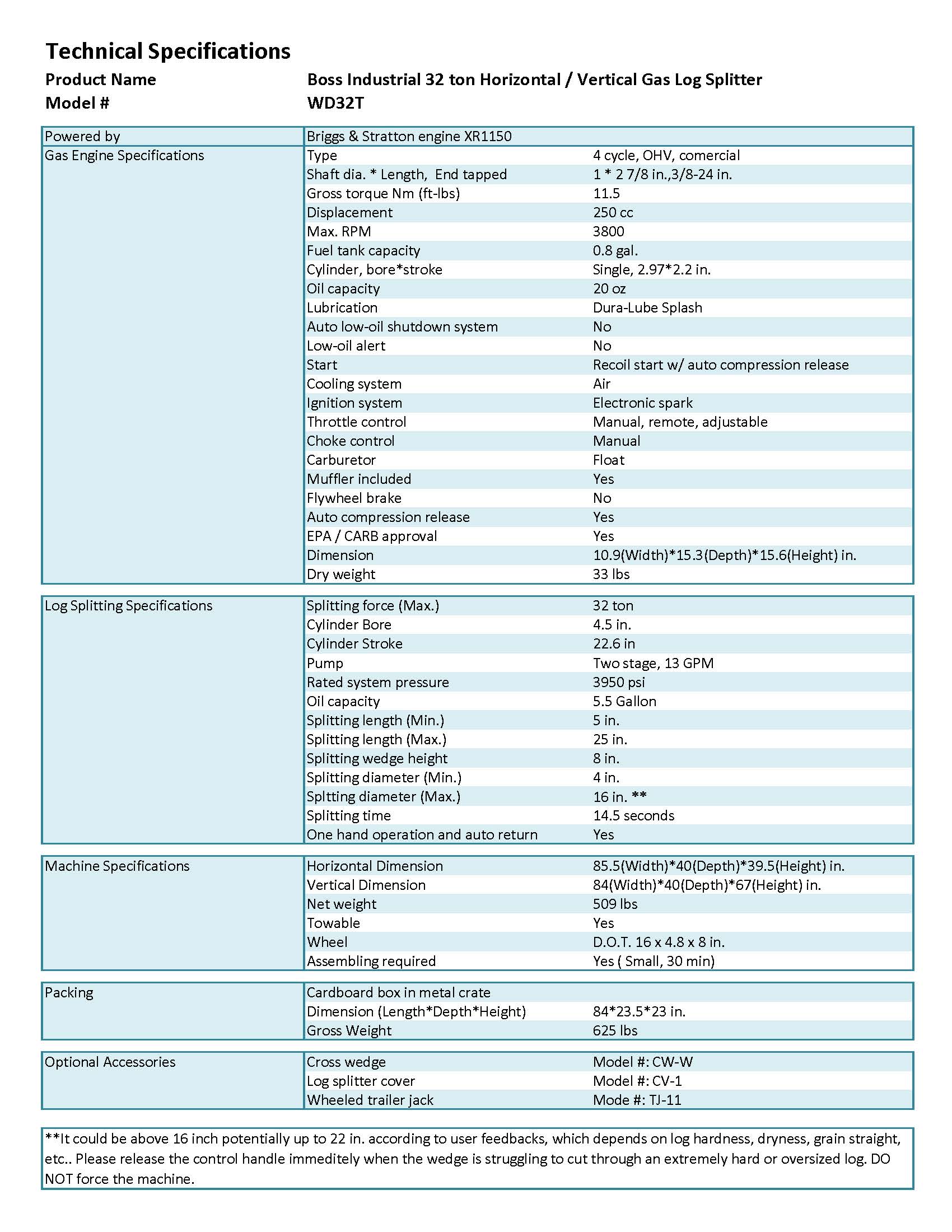 Max Splitting Length: 25 inches