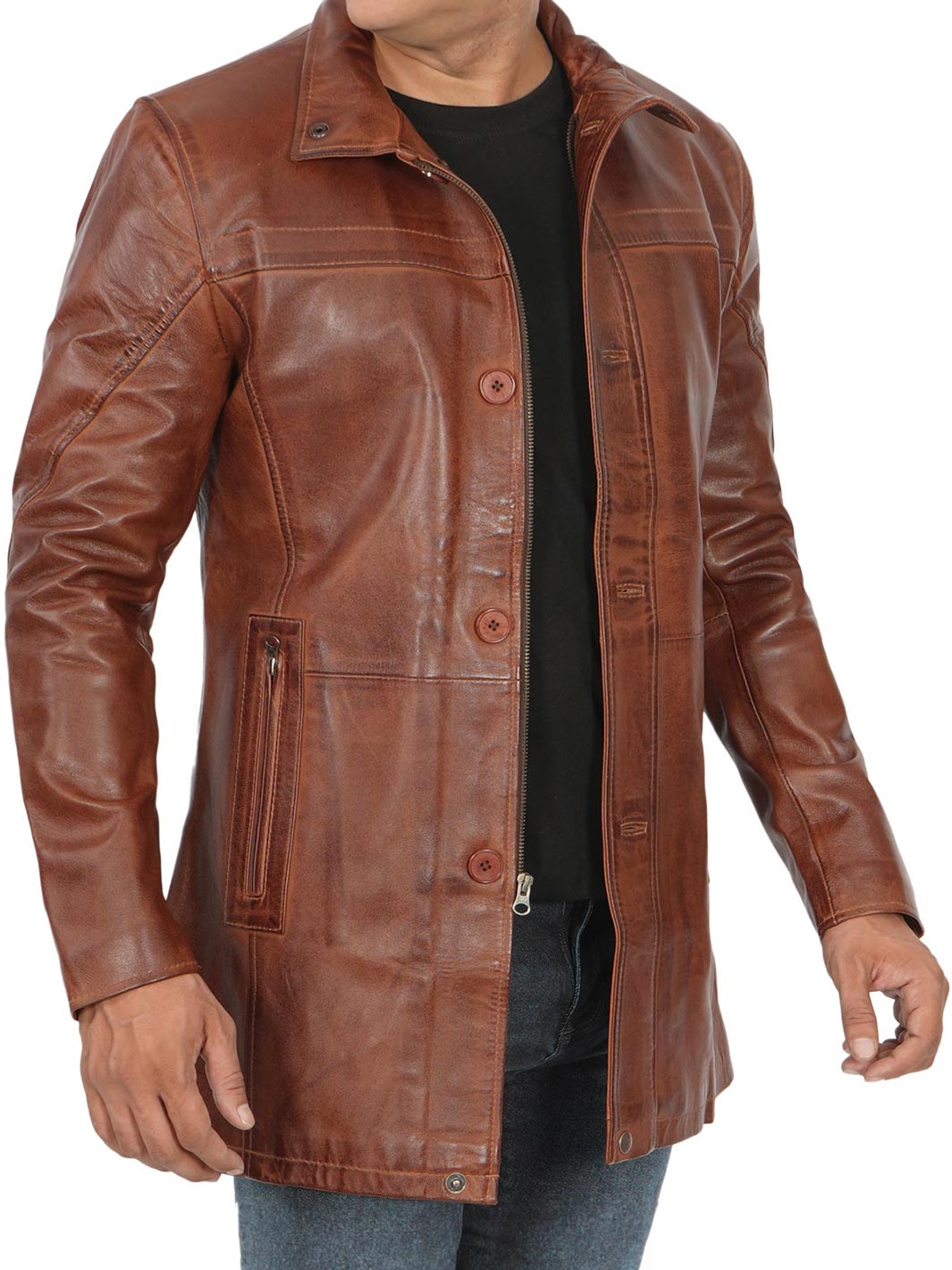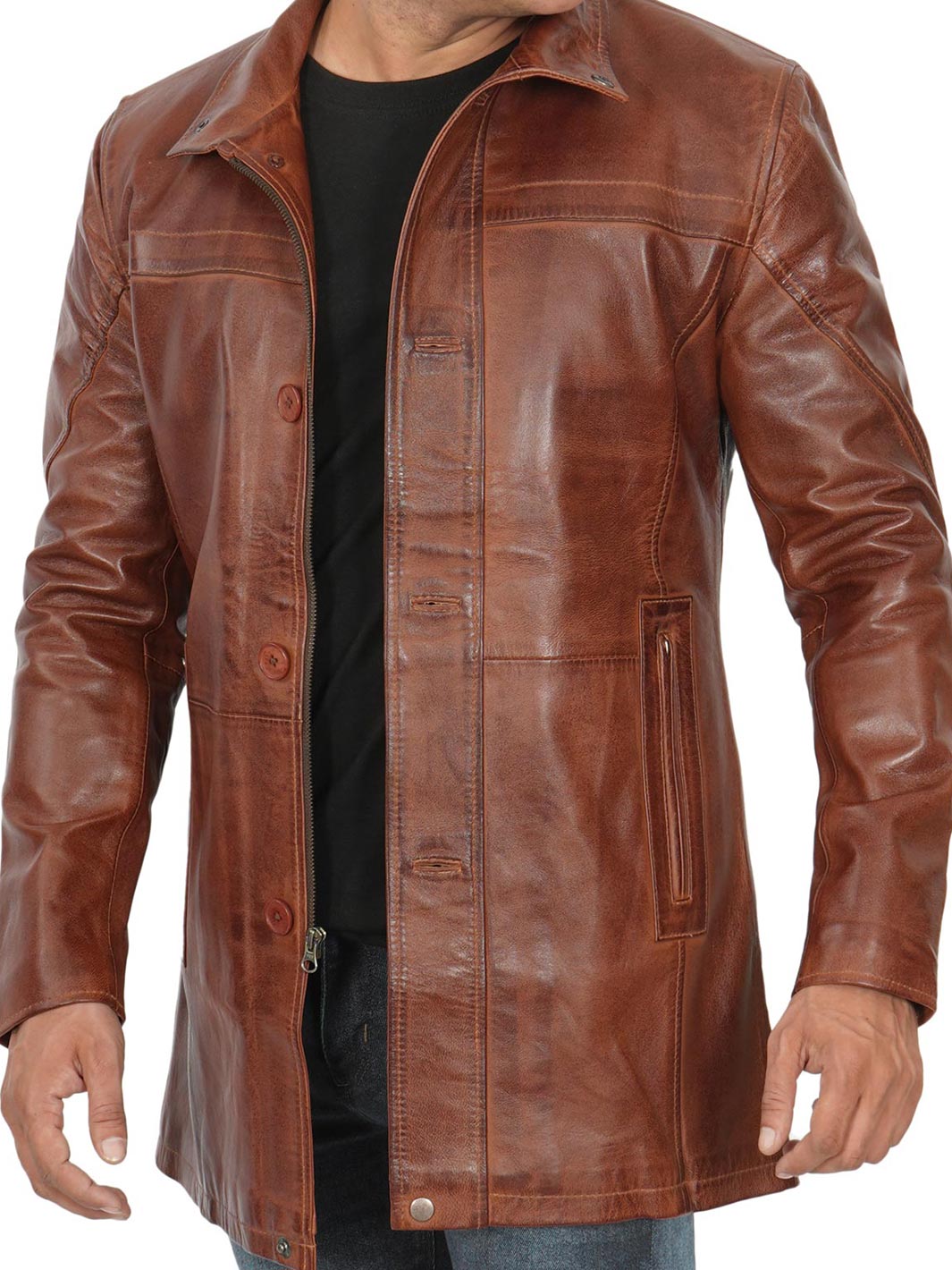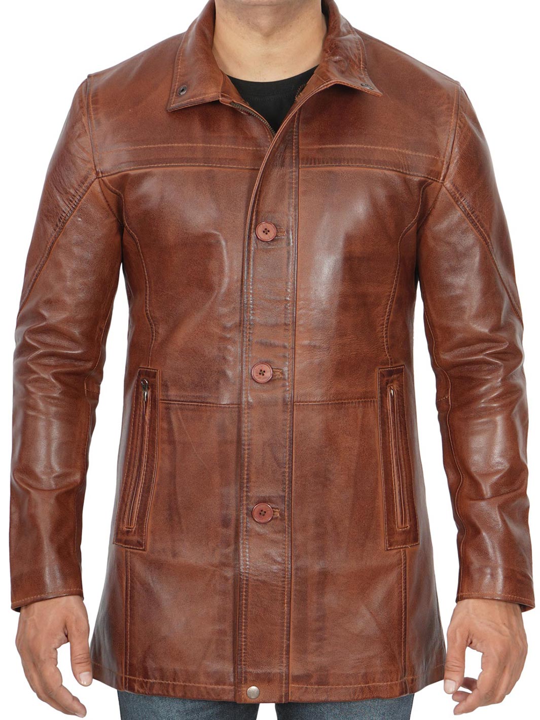 Elevate your style with our Tall Men’s Vintage Cognac Leather Car Coat. Crafted for sophistication and suitable for various occasions, it’s your ultimate choice.