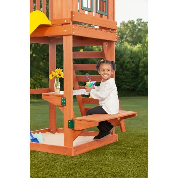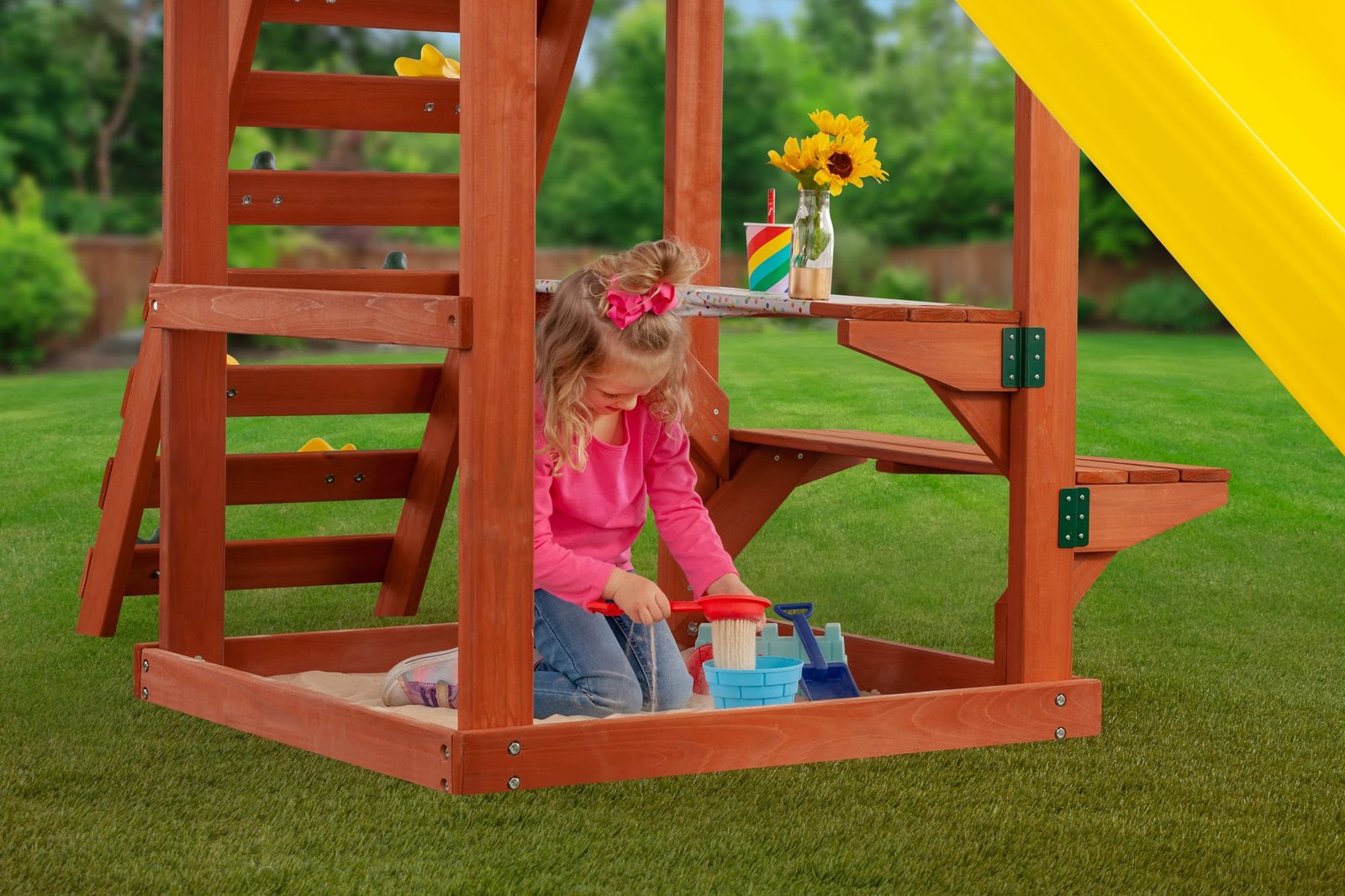 Designed for small backyards, the Cedar Cottage complete wooden swing set by Creative Cedar Designs only takes up a 13.5 ft wide x 11.5 ft deep footprint in your backyard. Inspired by a cute country cottage, this wooden swing set features charming details like a windowpane lookout to welcome visitors from the 4 ft. tower. The tarp roof and awning cover the tower as well as shade the picnic table down below for a cool, comfortable tea party or picnic. Create sandcastles galore beneath the tower, and steer a racecar or ship with the heavy duty steering wheel up above! Jet down the slide to feel the wind in your hair, and race one another on the swings. Flip like a circus performer on the trapeze and scale the rock climbing wall like an explorer! The Cedar Cottage Wooden Swing Set includes all wood, hardware, accessories, and instructions necessary for assembly.