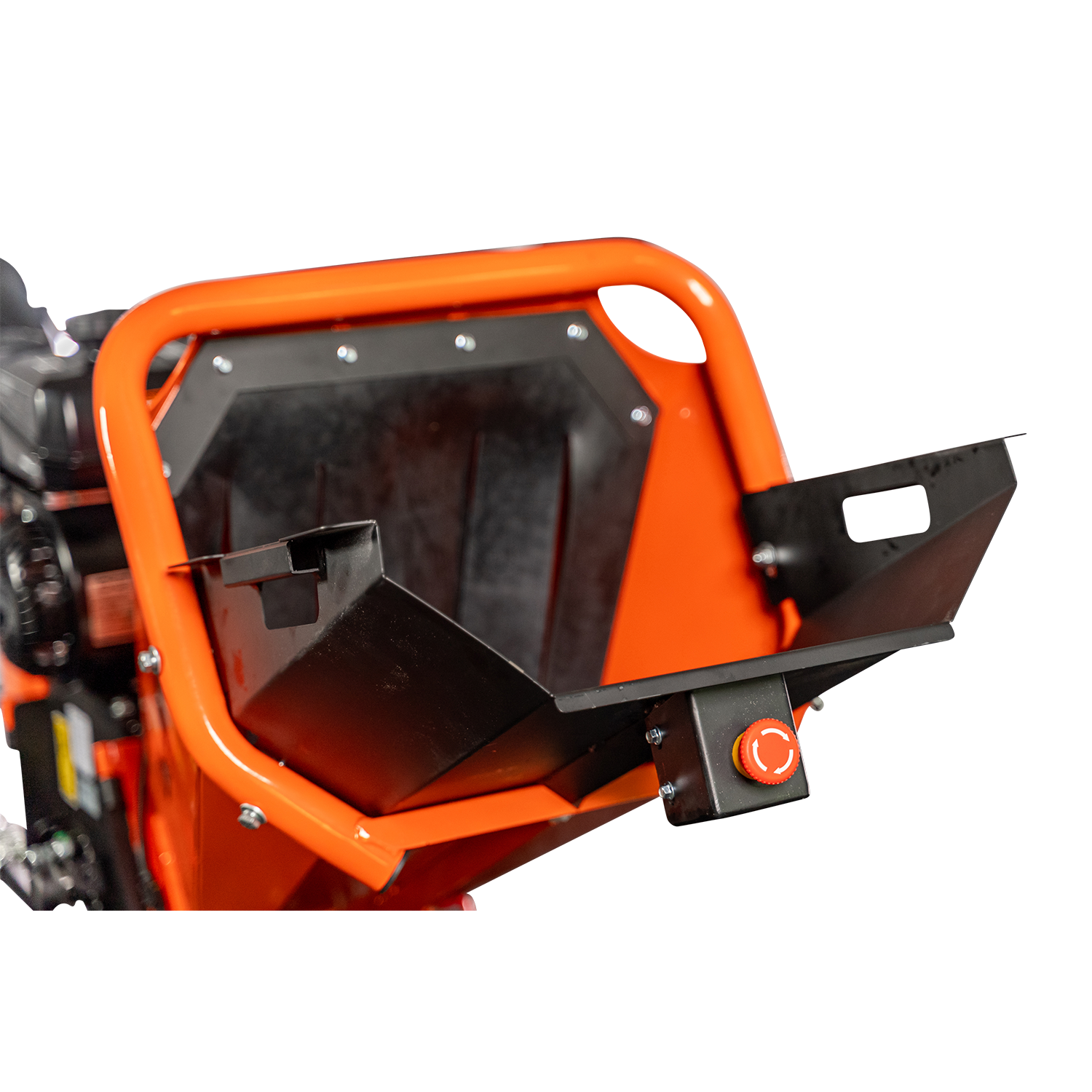 Extra-large extended feed chute with integrated equipment moving handles and easy-stop shutoff