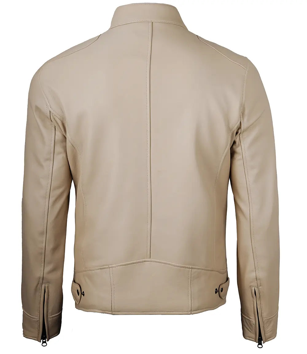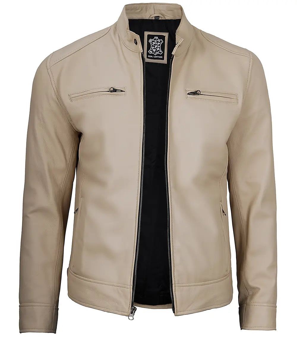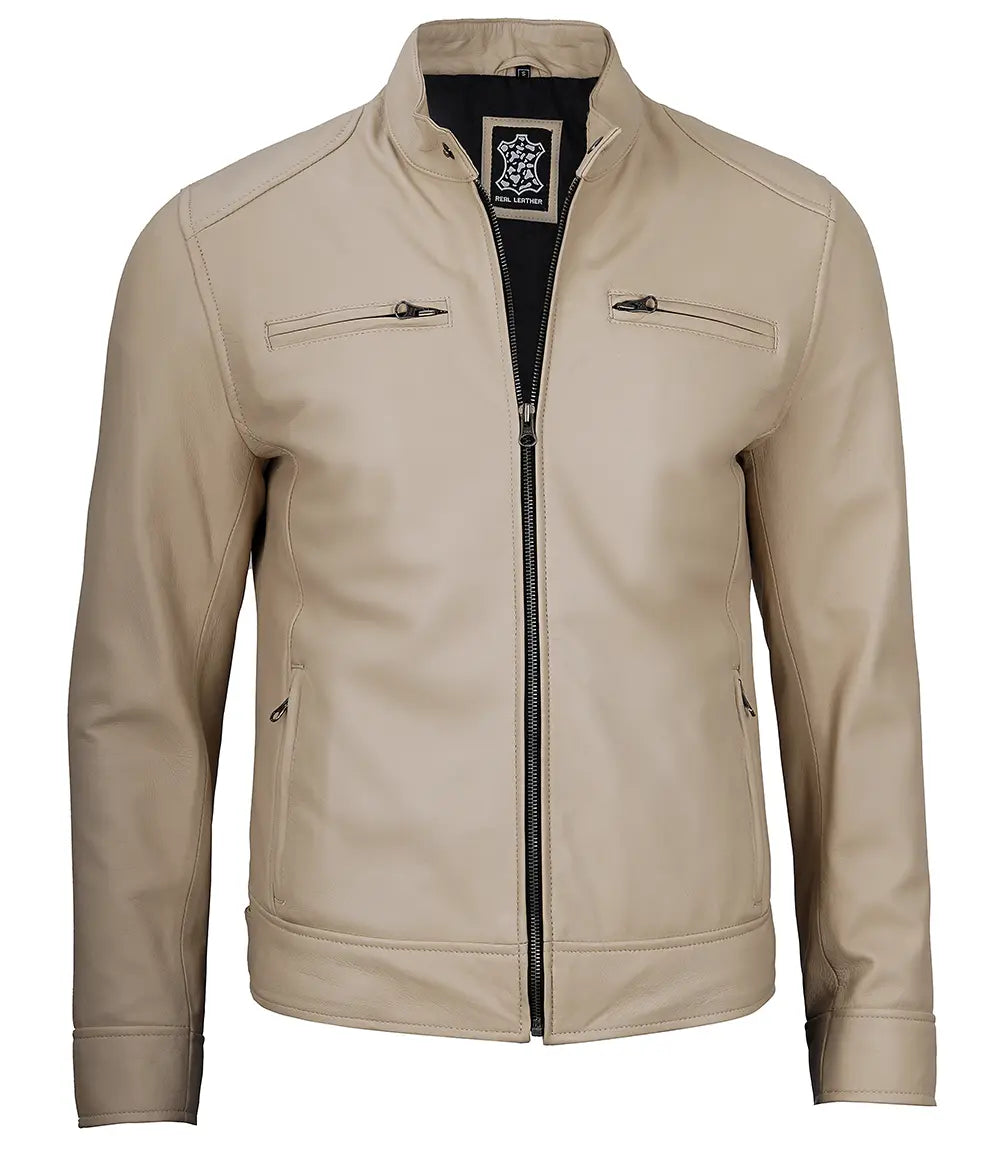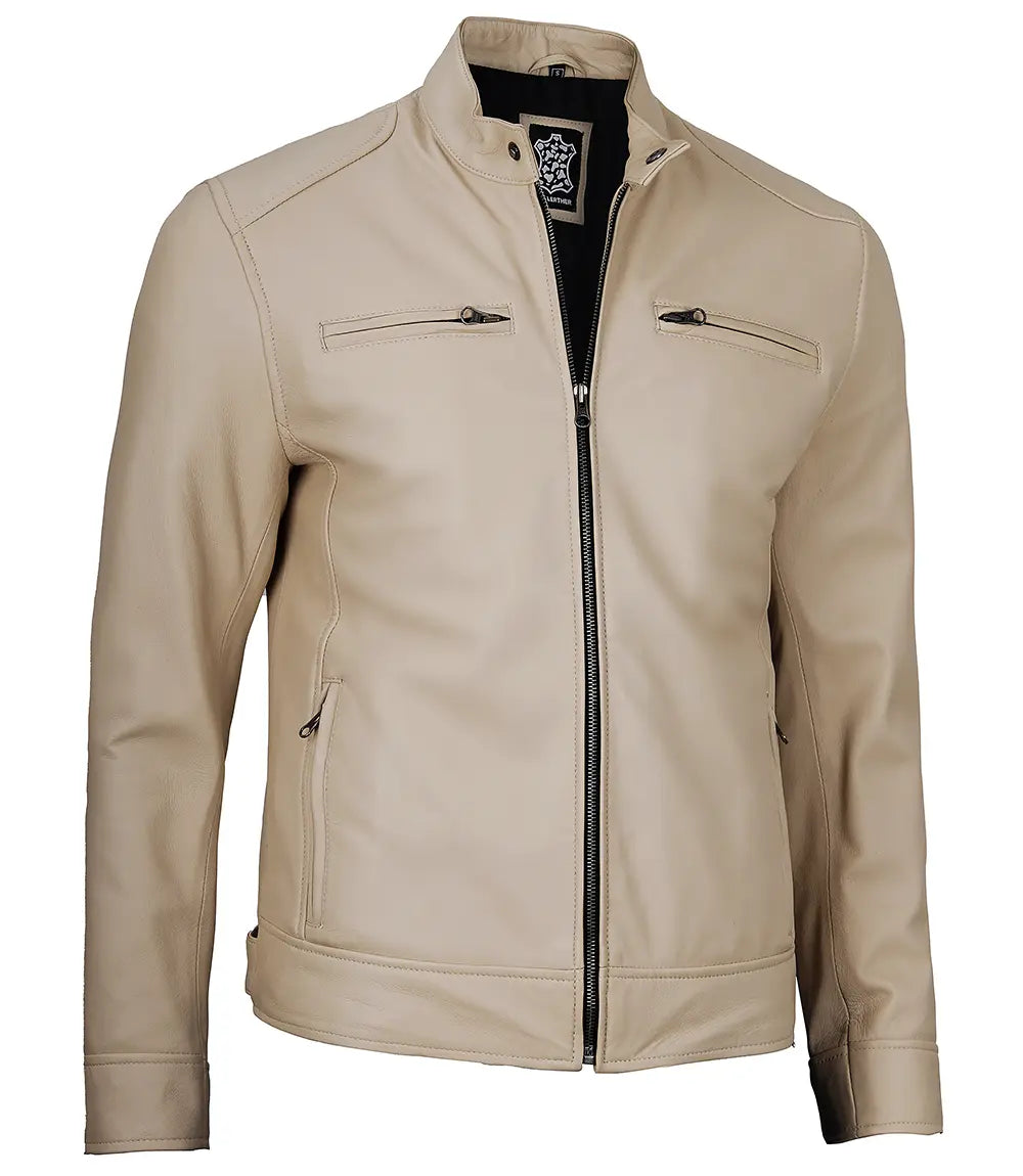 Dodge Beige Cafe Racer Leather Biker Jacket