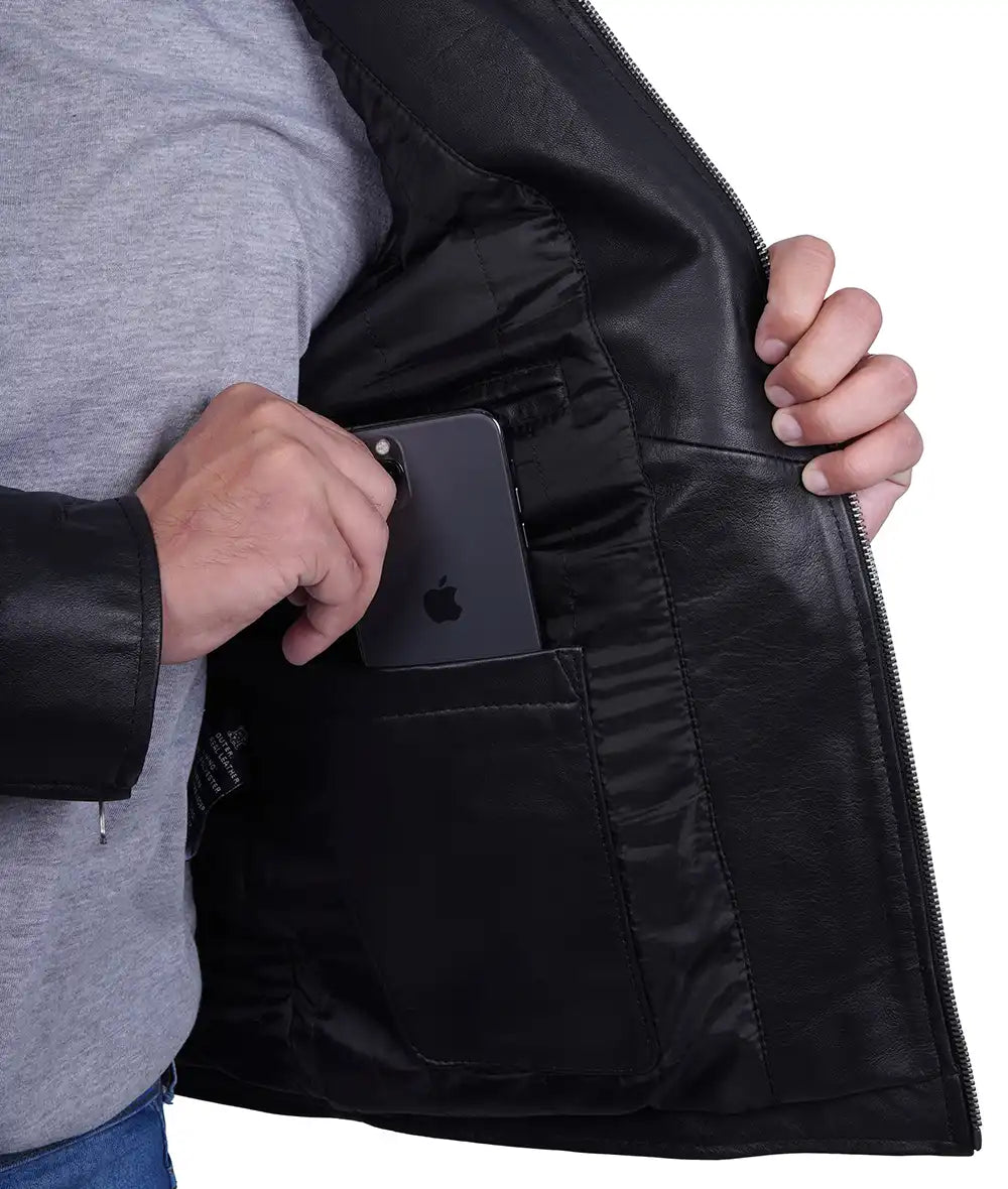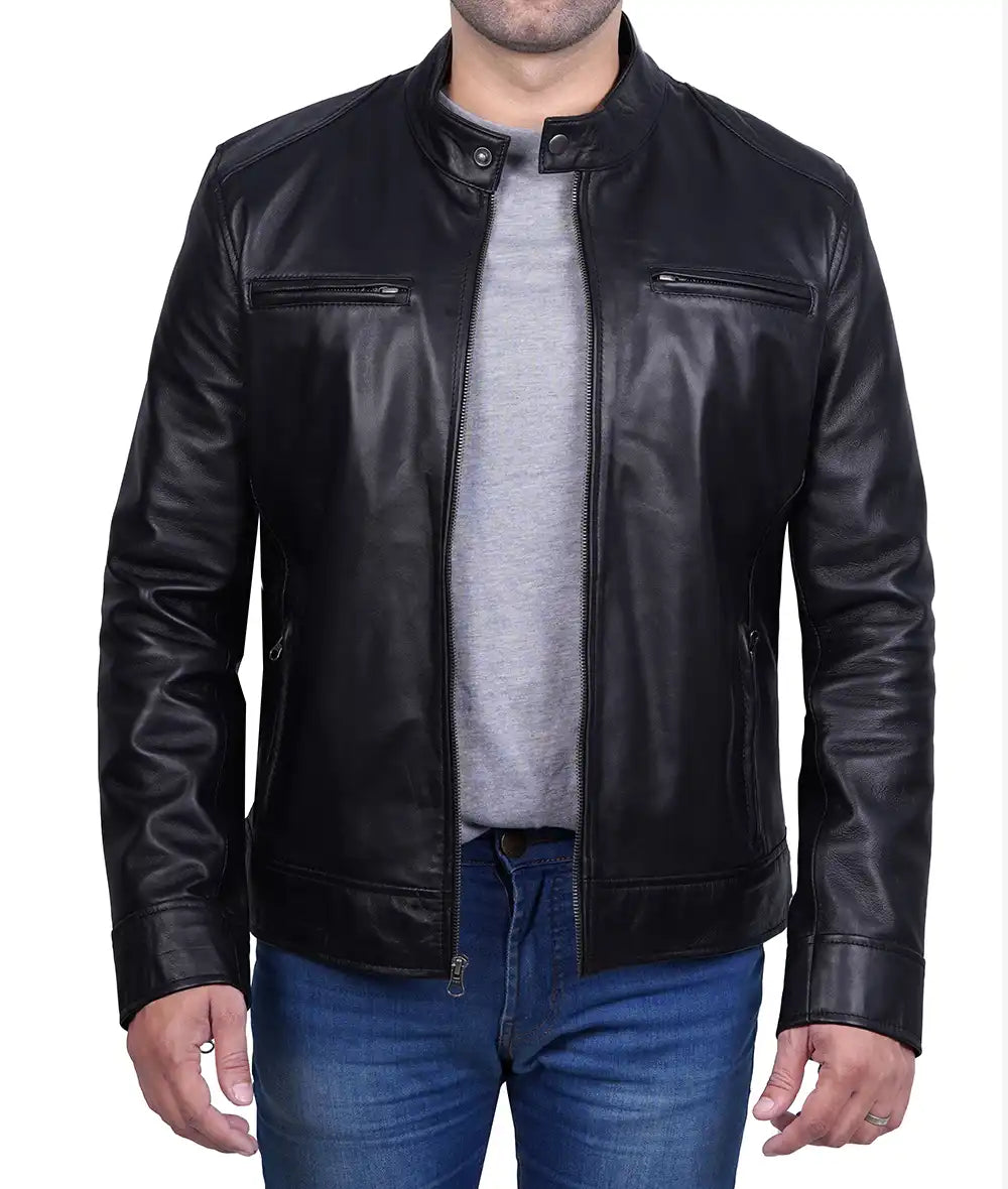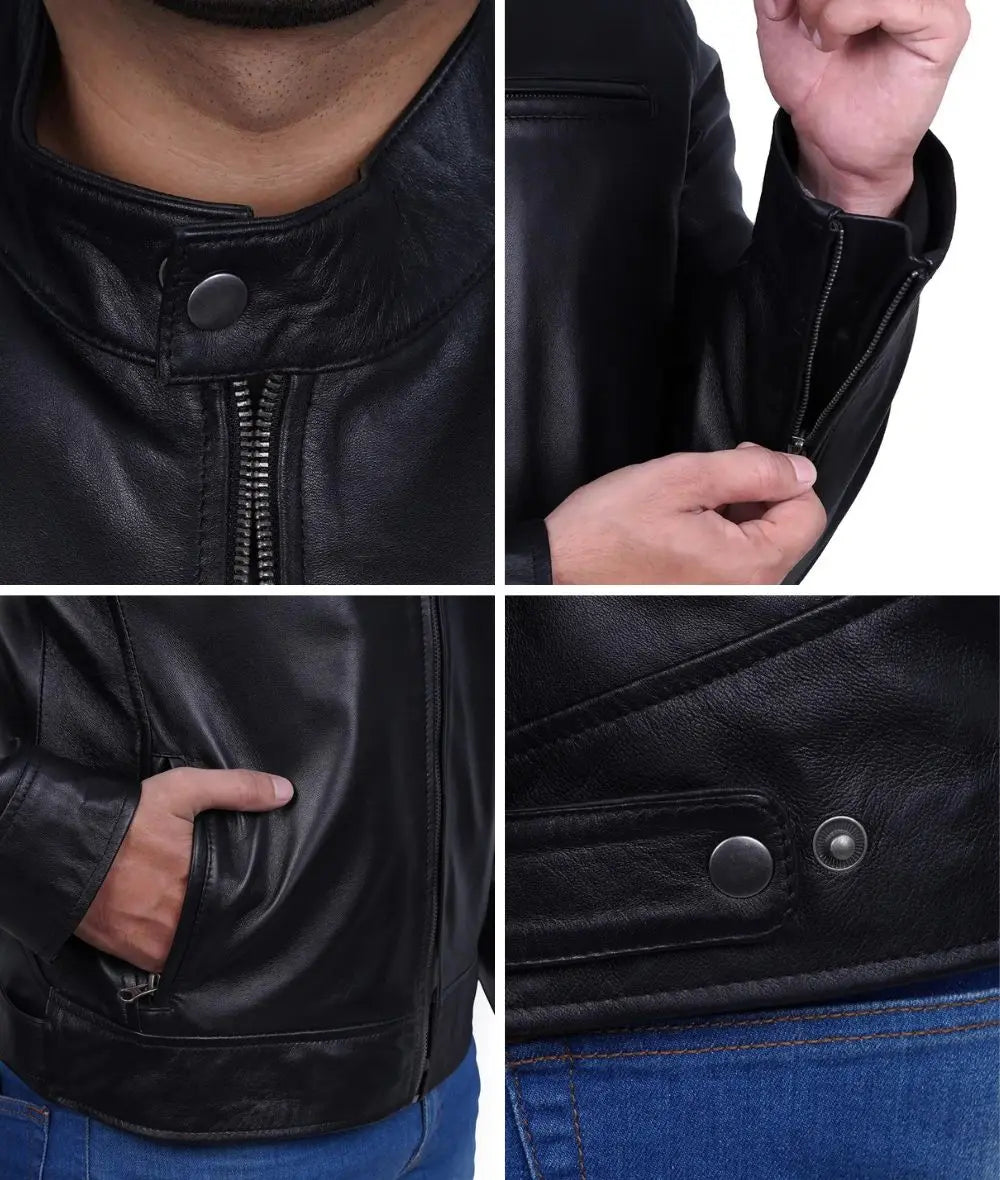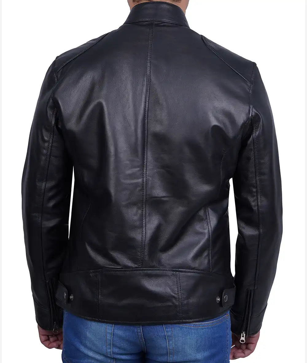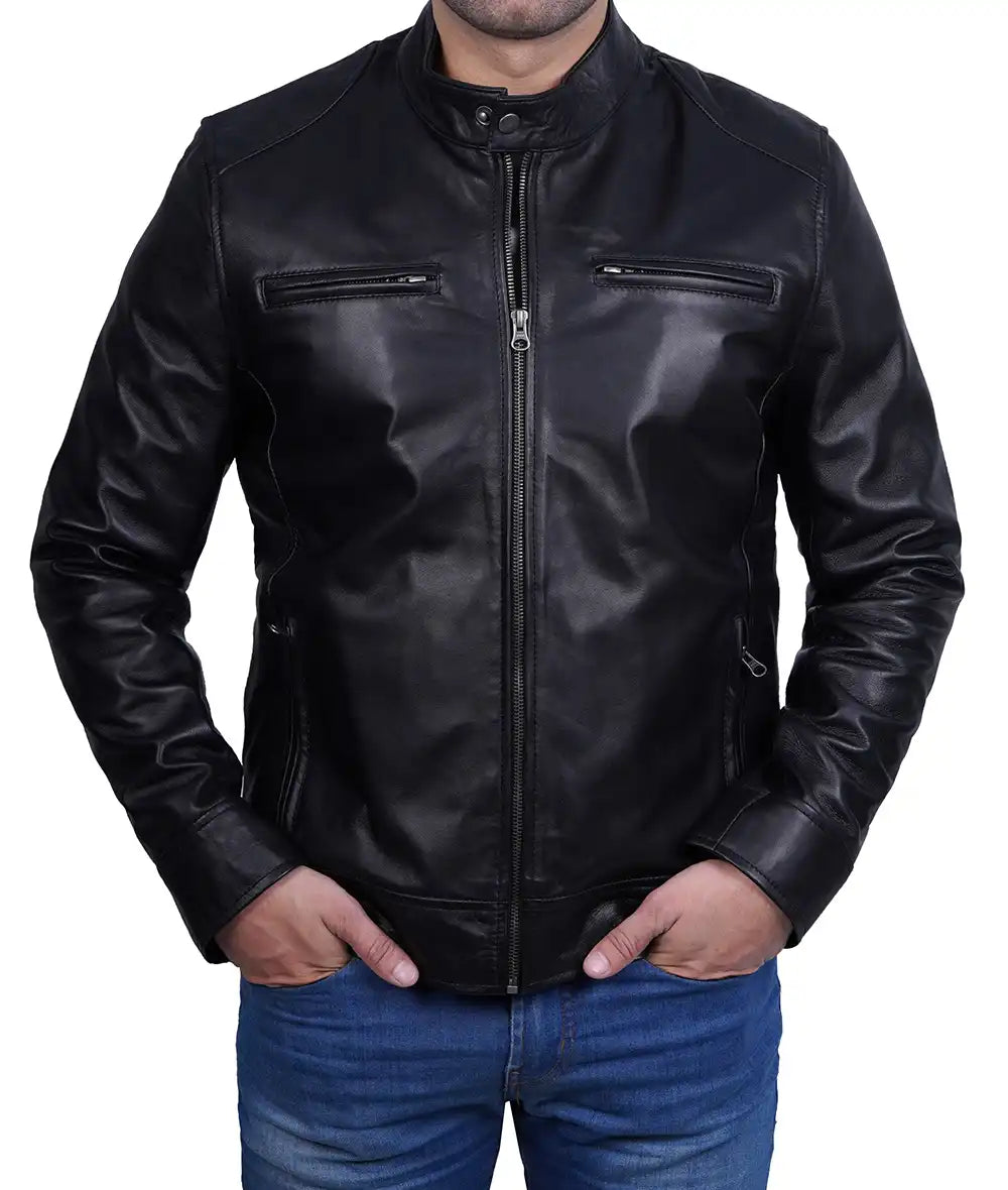 Dodge Mens Black Cafe Racer Leather Biker Jacket