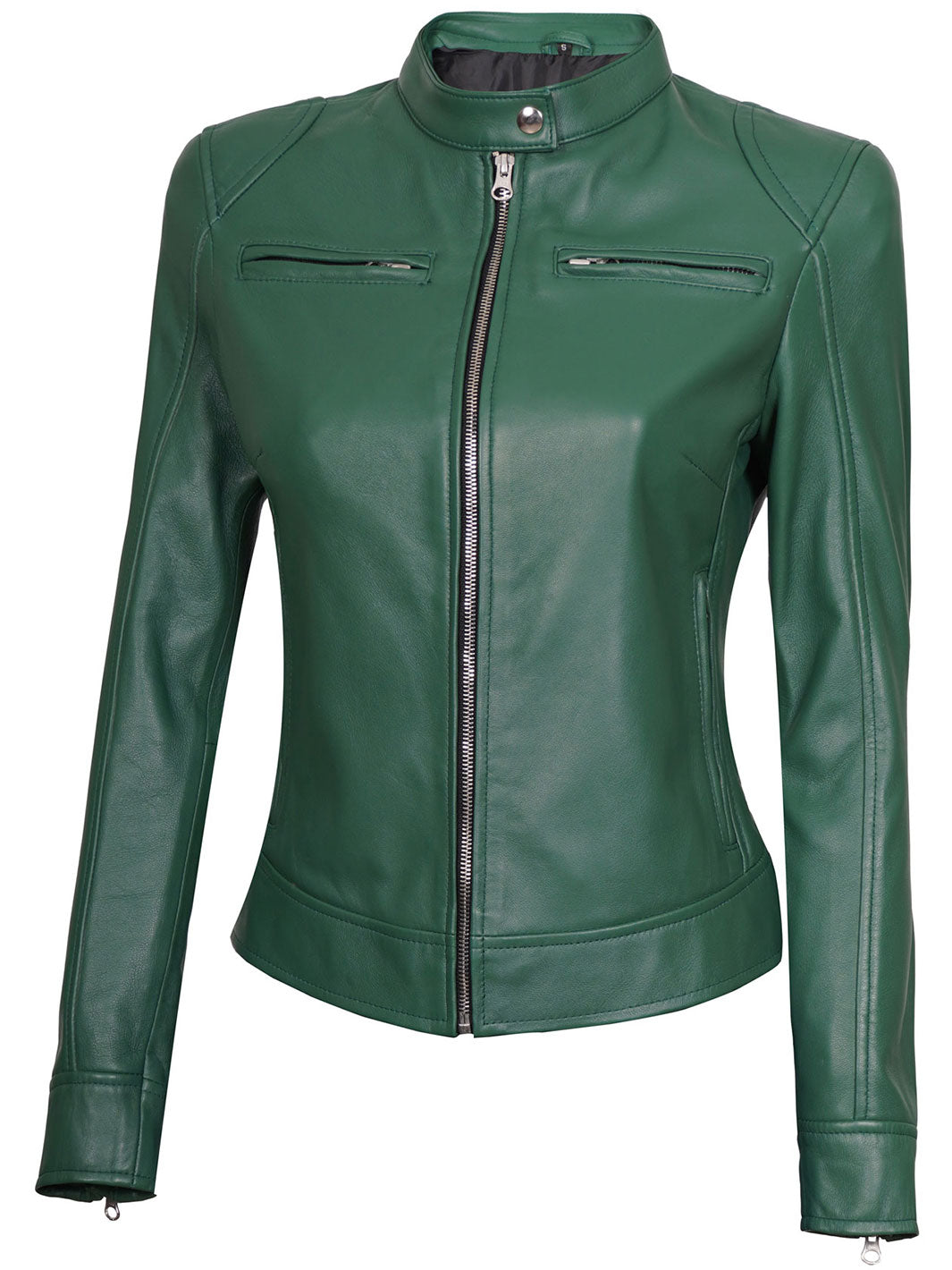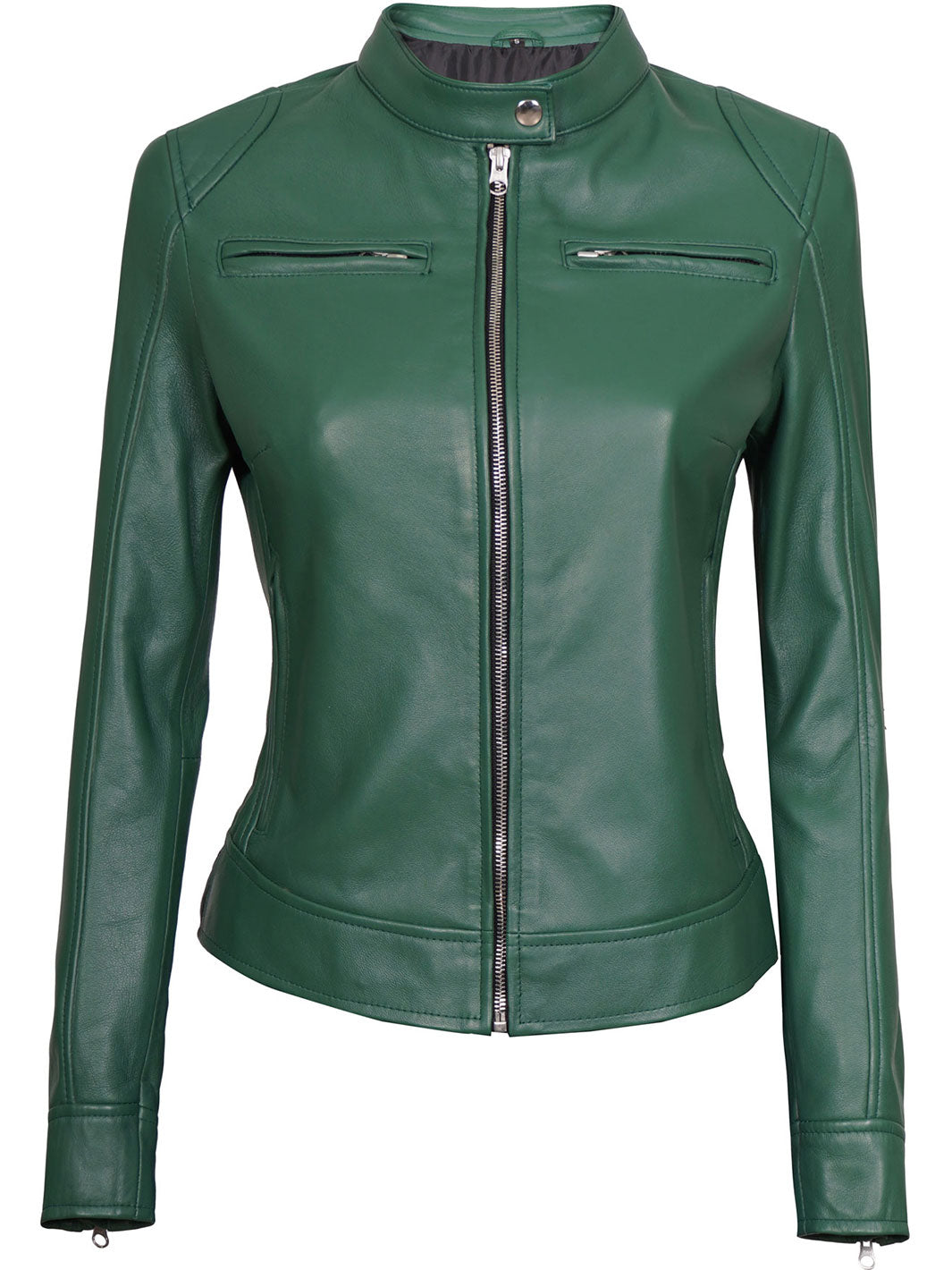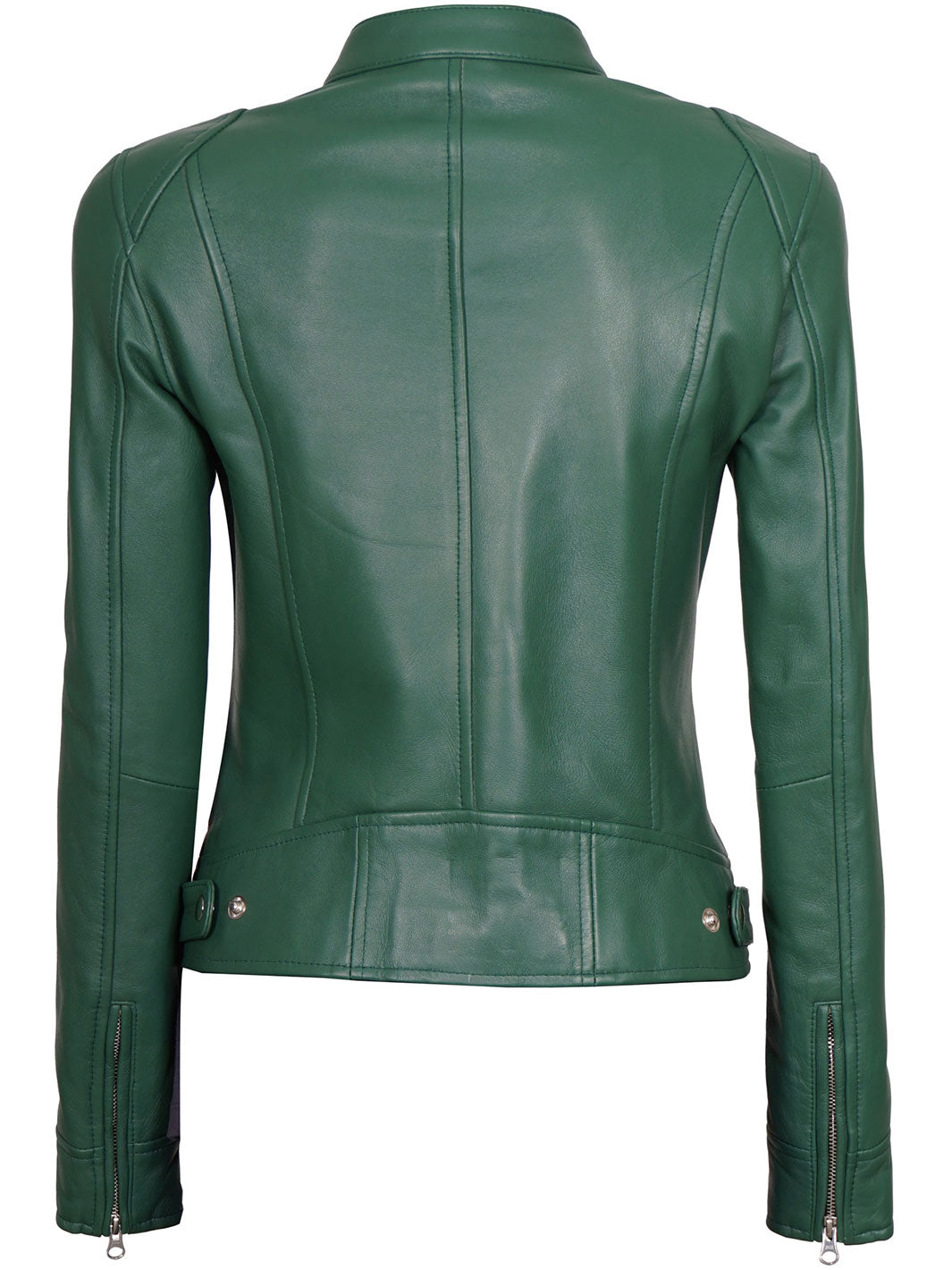 Embrace a style that’s hard to forget with our Women’s Motorcycle Cafe Racer Green Leather Jacket. Crafted with precision from real lambskin leather, its vibrant green color is a beacon of uniqueness.
