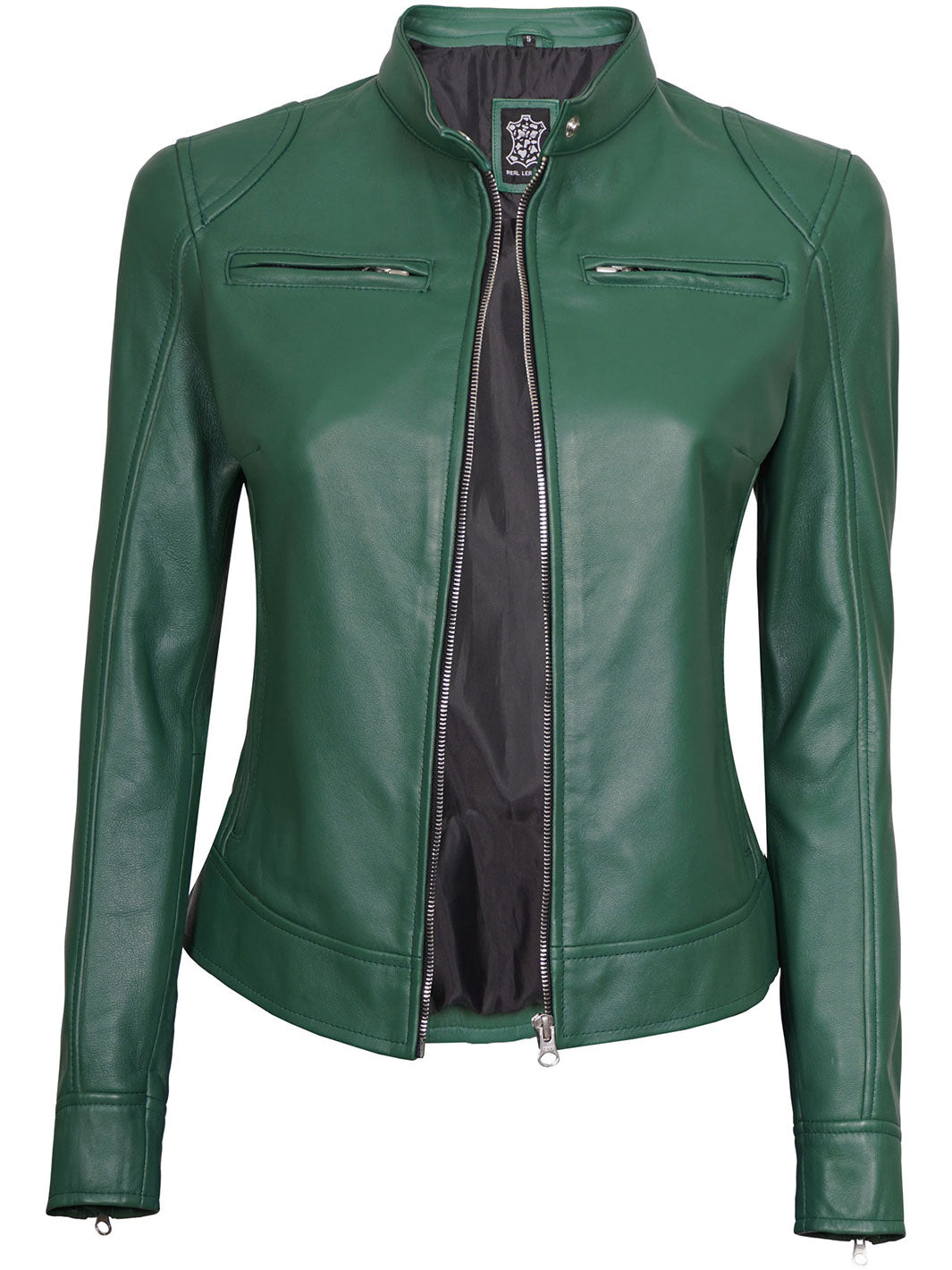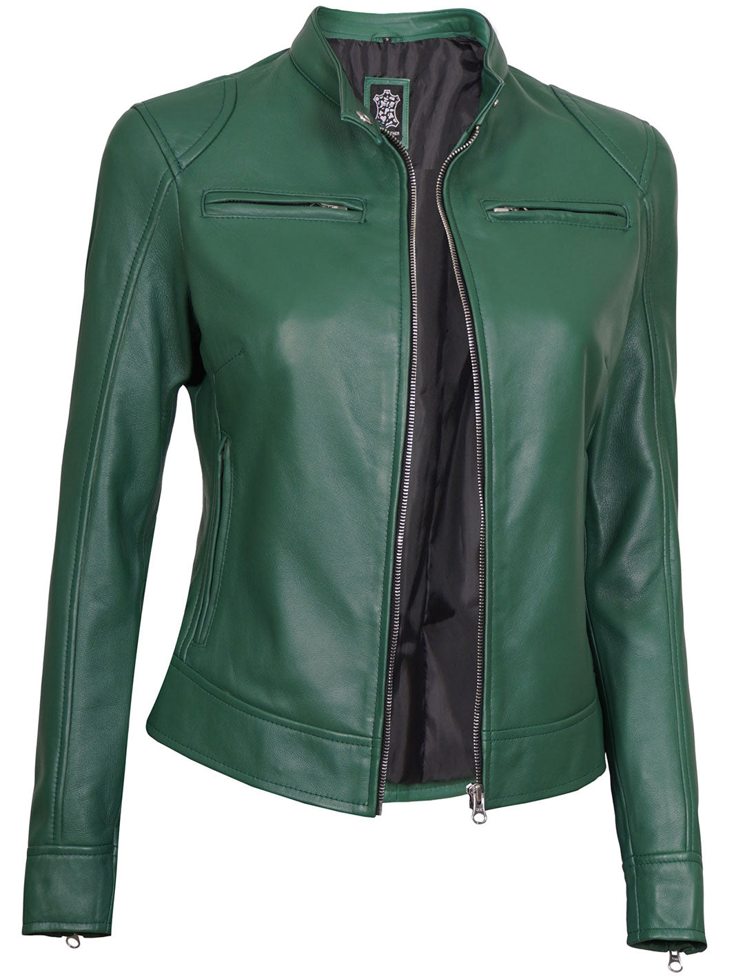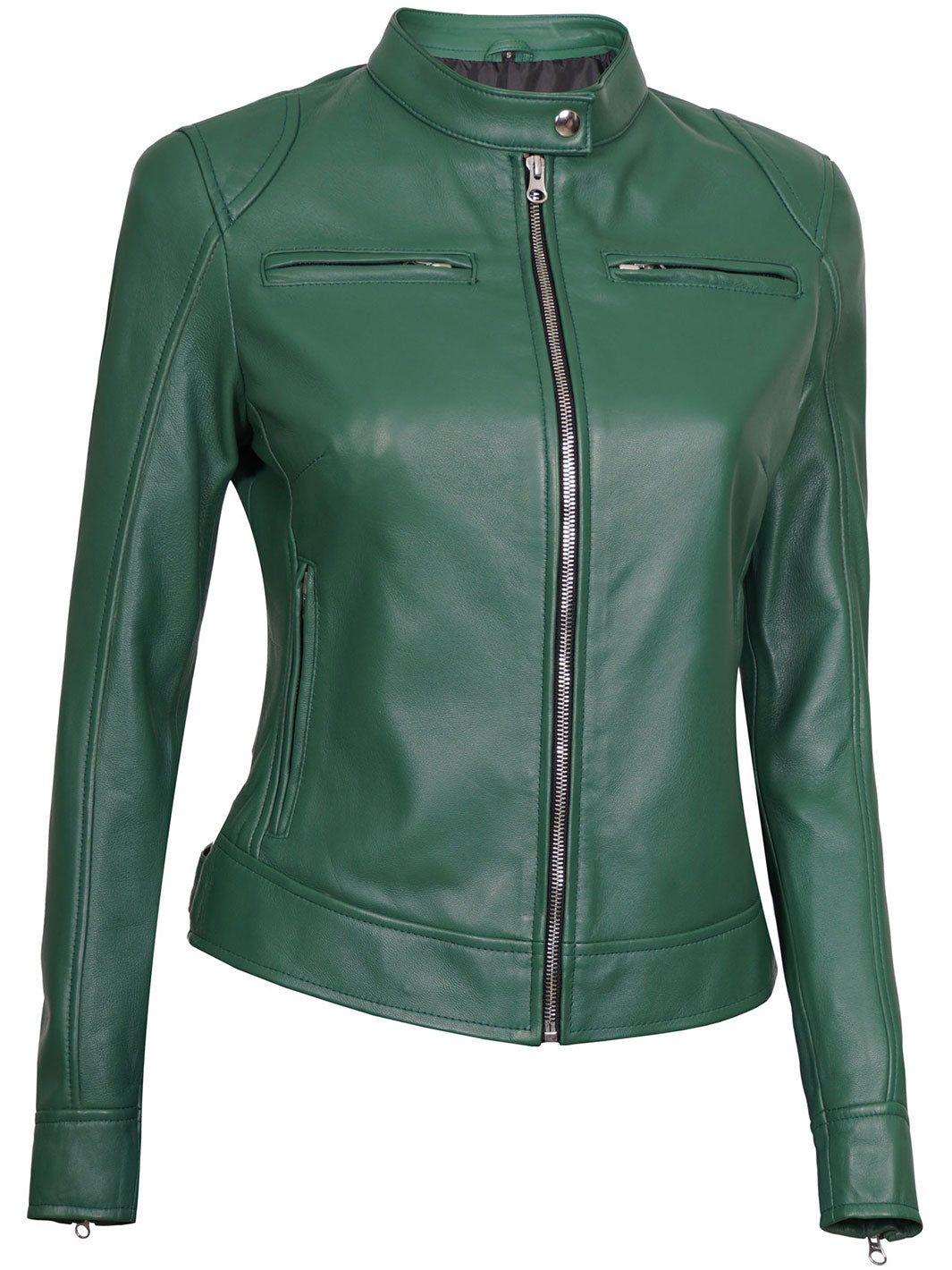 Embrace a style that’s hard to forget with our Women’s Motorcycle Cafe Racer Green Leather Jacket. Crafted with precision from real lambskin leather, its vibrant green color is a beacon of uniqueness.