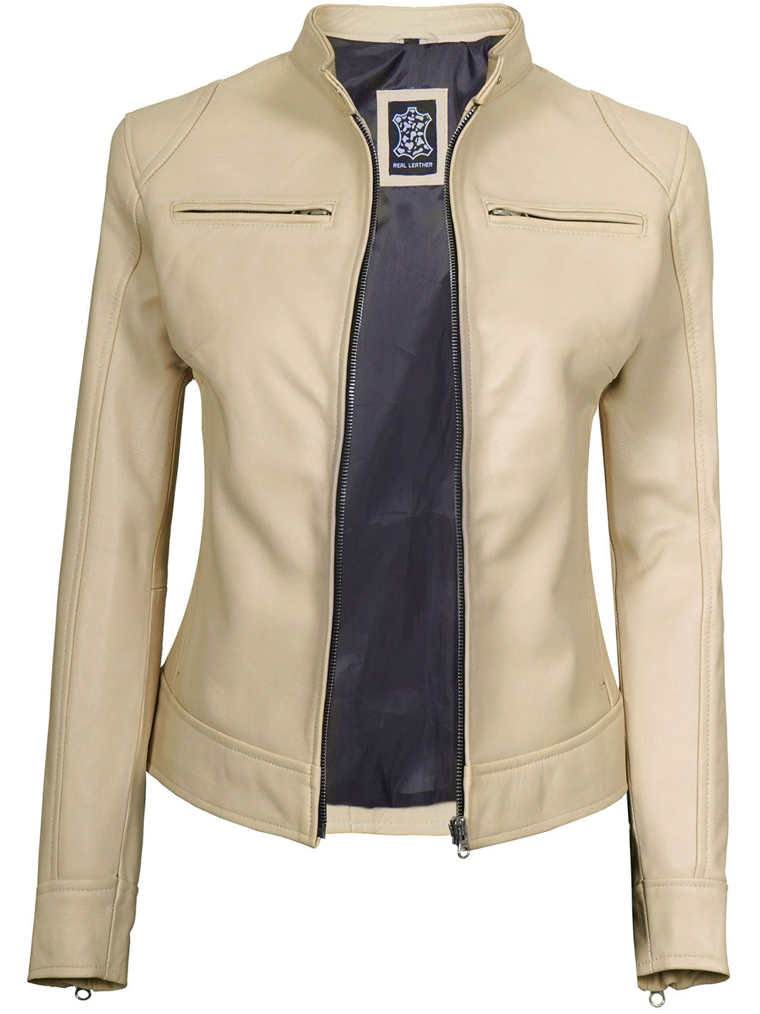 Dodge Women’s Beige Leather Cafe Racer Motorcycle Jacket