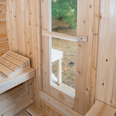 Only 13 left! 3 people are viewing this, and 5 recently purchased itCanadian Timber Serenity Barrel Sauna This Canadian Timber Collection Sauna by Dundalk LeisureCraft is handcrafted from Eastern White Cedar that is lighter in color and has tight knots in the wood. The door is 5mm bronze tempered glass with wooden frame and pre-hung on the front wall for easy installation. This Sauna kit comes with solid cedar cradles, aluminum bands with stainless steel hardware and is packaged in a ready to assemble kit. This model features a built in front porch with benches so you have a cooling down area on the outside of the sauna as well some protection from the front door when it is opened during sauna use. The round concept of the barrel sauna make it unique and very efficient to heat as well as encourages proper air flow during sauna use. Product Information Product Features Front Porch – 45cm Front Porch with benches included in with this model. Eastern White Cedar – Sustainable Sourced Eastern White Cedar Flat Floor Included – Flat Floor Included in Canadian Timber Saunas. Aluminum Bands – Marine Grade Aluminum Bands with stainless steel tightening bolts. Sturdy Wood Benches – Sturdy Bench Design for sitting up or laying down. Documents Product Drawing.pdf Parts List.pdf Assembly Instructions.pdfCanadian Timber Serenity Barrel SaunaThis Canadian Timber Collection Sauna by Dundalk LeisureCraft is handcrafted from Eastern White Cedar that is lighter in color and has tight knots in the wood. The door is 5mm bronze tempered glass with wooden frame and pre-hung on the front wall for easy installation. This Sauna kit comes with solid cedar cradles, aluminum bands with stainless steel hardware and is packaged in a ready to assemble kit.This model features a built in front porch with benches so you have a cooling down area on the outside of the sauna as well some protection from the front door when it is opened during sauna use. The round concept of the barrel sauna make it unique and very efficient to heat as well as encourages proper air flow during sauna use.Product InformationProduct FeaturesFront Porch – 45cm Front Porch with benches included in with this model.Eastern White Cedar – Sustainable Sourced Eastern White CedarFlat Floor Included – Flat Floor Included in Canadian Timber Saunas.Aluminum Bands – Marine Grade Aluminum Bands with stainless steel tightening bolts.Sturdy Wood Benches – Sturdy Bench Design for sitting up or laying down.DocumentsProduct Drawing.pdfParts List.pdfAssembly Instructions.pdfCanadian Timber Serenity Barrel SaunaThis Canadian Timber Collection Sauna by Dundalk LeisureCraft is handcrafted from Eastern White Cedar that is lighter in color and has tight knots in the wood. Th
