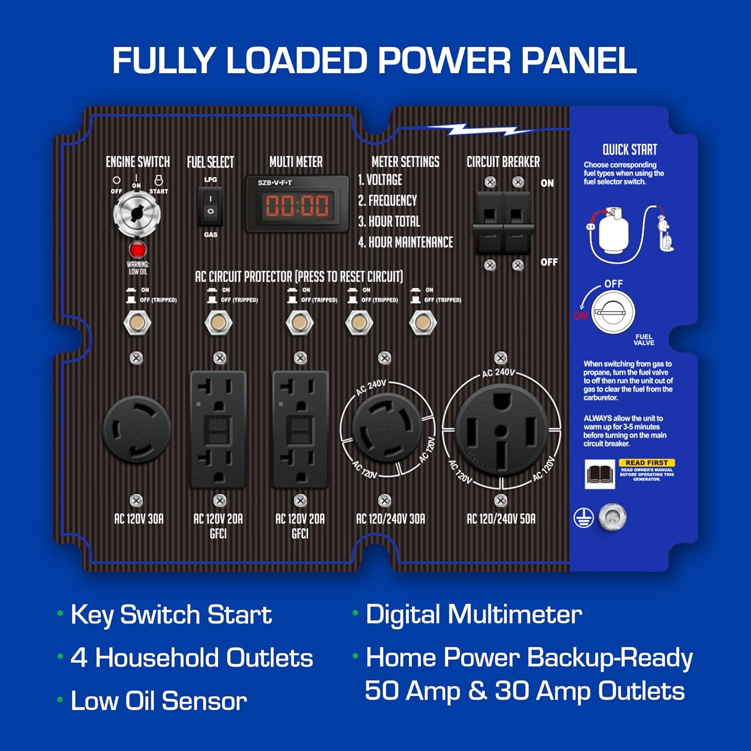 The XP13000EH comes with a push button start, a front facing interface that allows you to change your fuel type in seconds, and a wide variety of outlets (including a transfer switch-ready 50 amp outlet)