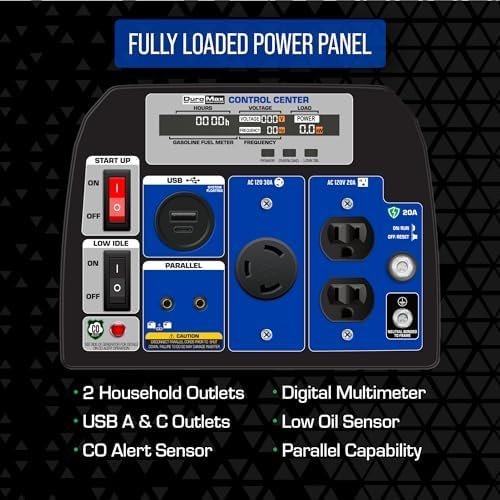 Digital Control Center – The Digital Control Center features an LCD display showing gas level, hours run, voltage output, and load level.