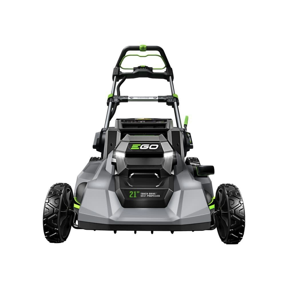 The EGO POWER+ 21” Self-Propelled Mower with Touch Drive™ delivers 6.0 foot-pounds of cutting torque—power that exceeds gas without the noise, fuss, or fumes. Touch Drive™ technology puts complete control of the self-propelled system in the palm of your hands by using pressure to engage the system. Easily control the variable speed with a dial positioned at your fingertips for safe and convenient operation. This cordless lawn mower delivers up to 80 minutes of combined run time on a single charge with the included 56V 4.0Ah and 6.0Ah ARC Lithium™ batteries. The electric lawn mower delivers precision cutting with its advanced mulching blade and seven cutting height positions from 1.25 to 4 inches, adjustable with one hand. Three-in-one functionality delivers your choice of mulching, side discharge, or bagging your grass clippings; an easy-access two-bushel grass collection bag is included. This self-propelled lawn mower includes bright LED lights for added visibility when mowing at dawn or dusk, and it folds flat for compact storage between cuts. Experience Power Beyond Belief™ with the EGO POWER+ 21” Self-Propelled Lawn Mower with Touch Drive™.