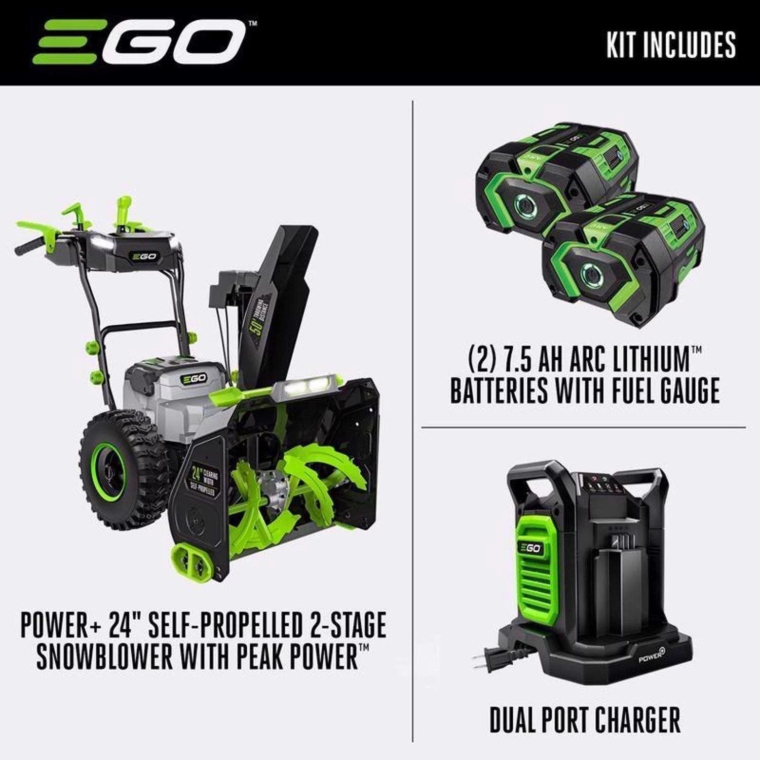 The EGO POWER+ Cordless 2-Stage Snow Blower exceeds the power and performance of gas-powered snow blowers without the noise, fuss, and fumes. Featuring Peak Power technology, this cordless electric snow blower combines the power of any two EGO 56V ARC Lithium batteries to tackle the toughest snow conditions and what the snowplow leaves behind with ease—and throws it up to 50 feet. Its 24-inch clearing width and 20-inch intake height handles even the deepest snow, and its variable-speed auger and 200-degree chute direction give you complete control to throw snow where you need it. Get the job done easily with variable-speed self-propelled forward and reverse directions along with four LED lights for added visibility in early morning or evening. Clear 8 inches of snow from a 18-car driveway with the two included 7.5Ah batteries. Experience Power Beyond Belief with the EGO POWER+ 2-Stage Cordless Snow Blower and the entire EGO POWER+ lineup.Find the SNOW BLOWER 2-STAG 24W at Ace.