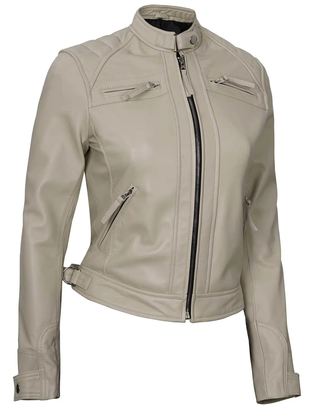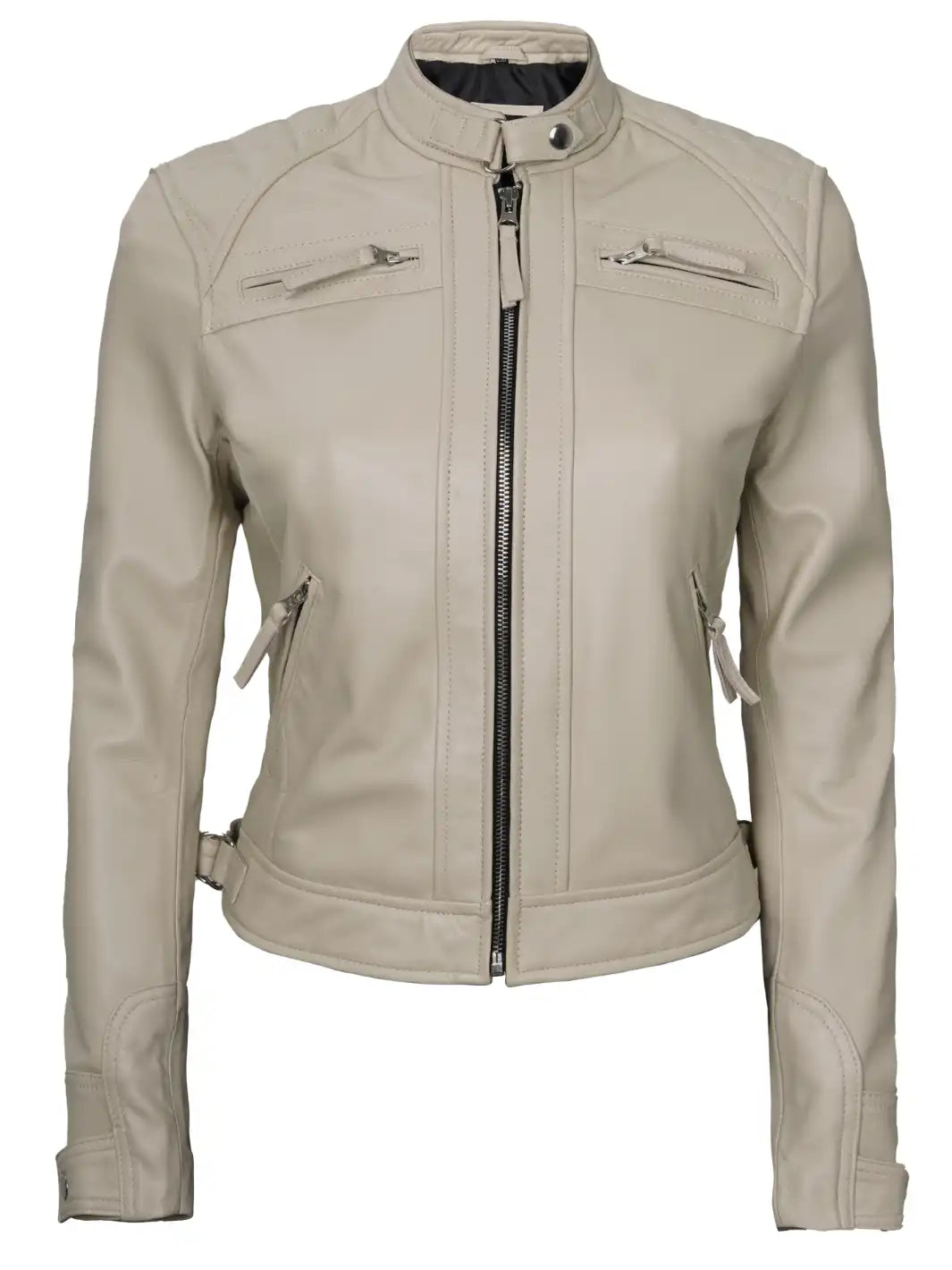 Johnson Women Beige Cafe Racer Leather Jacket