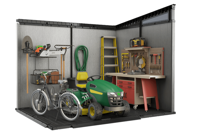 Storage shed made from polypropylene resin and steel reinforced to ensure durability – will not peel, rot, or rust and never needs painting