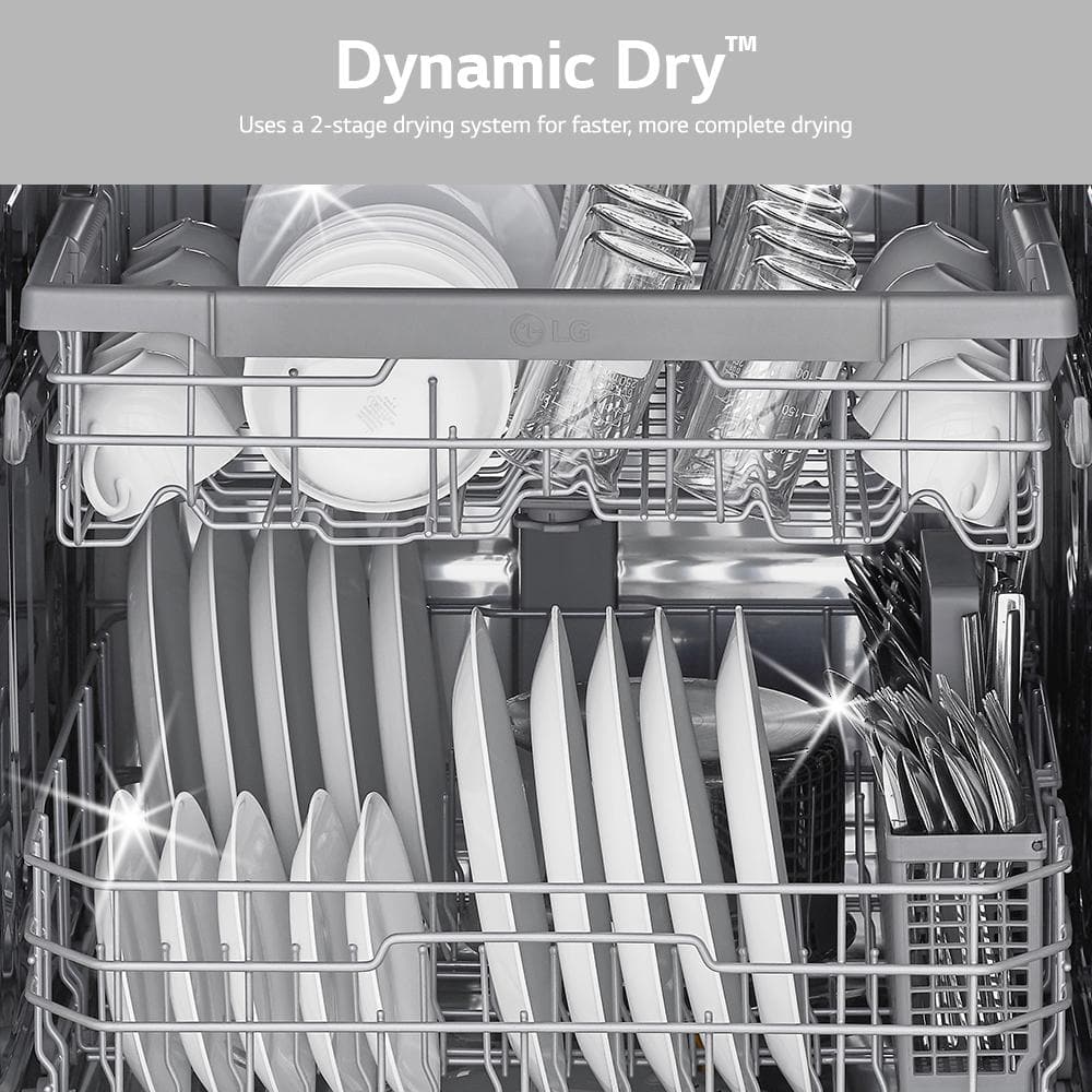 Dynamic dry technology on all LG dishwashers uses a 2-stage drying system for faster, more complete drying