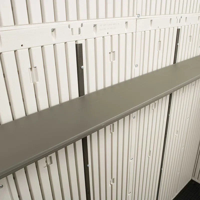 â Plenty of space for large tools, lawn equipment, bicycles, patio furniture, and seasonal items â Built-in shelving system offers customizable organization options â Two shatterproof windows with shutters allow for natural lighting and ventilation