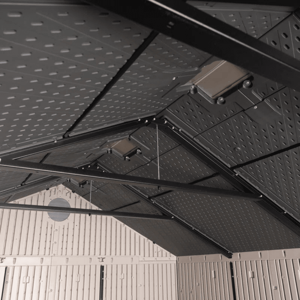 Its UV-protected, weather-resistant construction and high-pitched roof for efficient water drainage make it an ideal year-round storage solution. With built-in shelving, skylights, and steel-reinforced, lockable double doors, this shed provides security, functionality, and convenience—all in one.