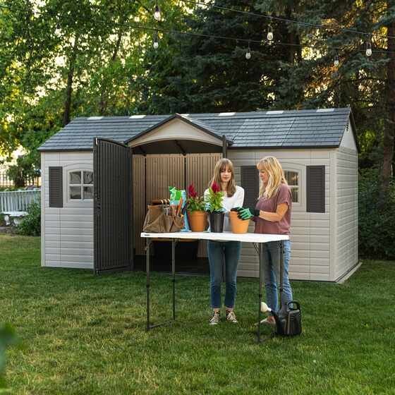 Maximize your storage and organization with the Lifetime 15-Foot x 8-Foot Outdoor Shed Kit. This premium Lifetime shed offers ample space for lawn mowers, bikes, tools, and sports gear, ensuring you have everything you need for outdoor maintenance and fun right at your fingertips. With a customizable shelf system, you can organize your equipment to suit your needs, while centralized doors provide easy access to all your items. Six skylights brighten the interior, enhancing visibility and making it a pleasant space to work in. Designed for low maintenance, the shed features a high-pitched roof for efficient rain and snow drainage, and UV-protected materials that resist weather damage. The high impact and slip resistant high-density polyethylene floor safeguards against oil and stains, as well as damage from drops.