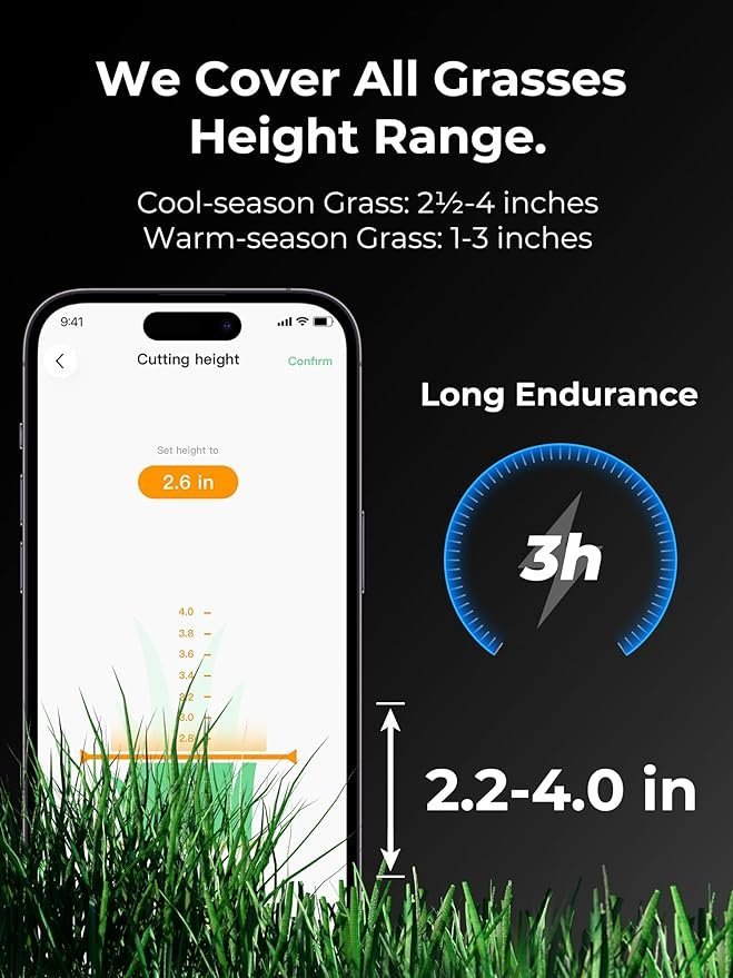 APP& Voice Control, Mowing is Breeze: Customize different cutting heights, mowing modes and frequencies for multi-zone or check the mowing progress and location from anywhere via your smartphone with the Mammotion app or integrate the automatic mower into your smart home setup with Amazon Alexa or Google Home.