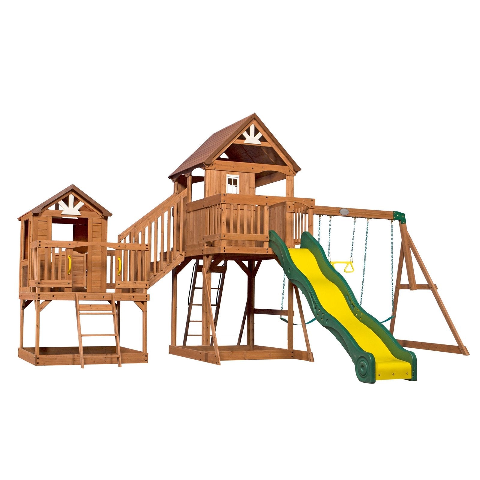 Its hillside-styled design boasts two comfortably sized clubhouses connected by a sturdy wooden staircase. Each has its own sun-soaked balcony and flat step entry ladder. And for extra fun, the lower fort contains a play sink and stove top.