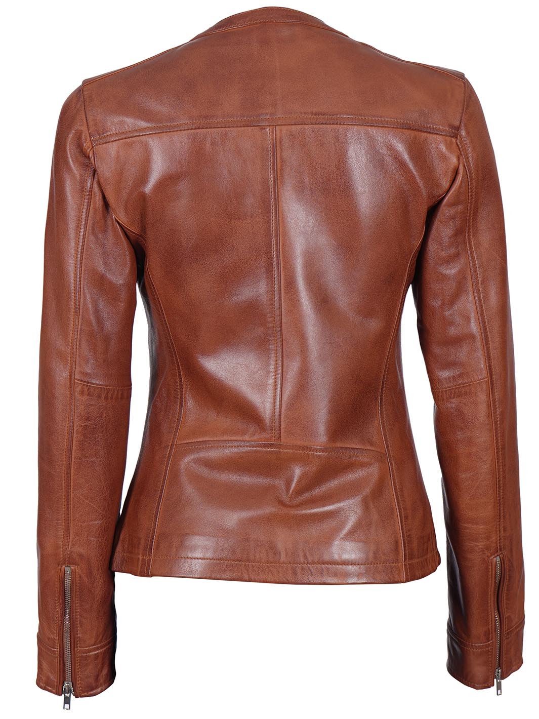 Dress confidently in the Maude Cognac Leather Biker Jacket. Its textured design and timeless cognac leather make it perfect for any occasion. It is a must-have for strolling the streets or exploring the city.