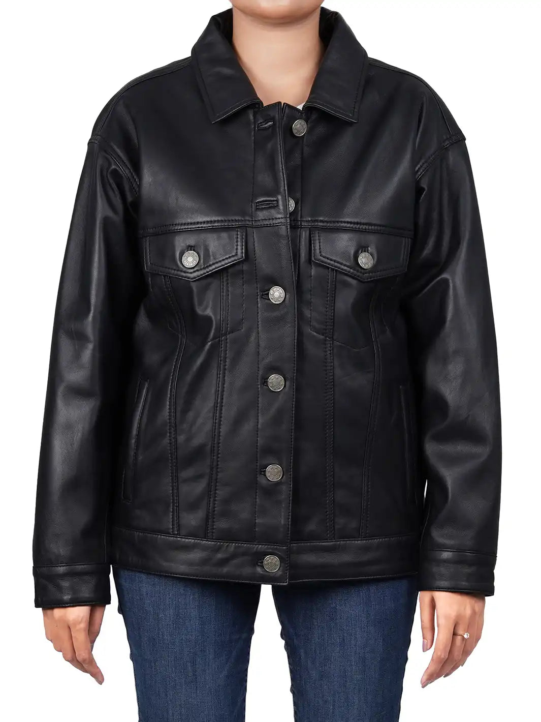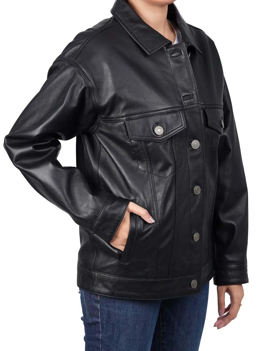 Experience timeless style and unparalleled comfort with our lambskin leather jacket. Soft, supple leather and a plush polyester lining create a luxurious feel. Featuring a classic shirt collar, multiple pockets, and an oversized fit, this jacket is effortlessly cool. Perfect for any occasion, from casual outings to stylish evenings.