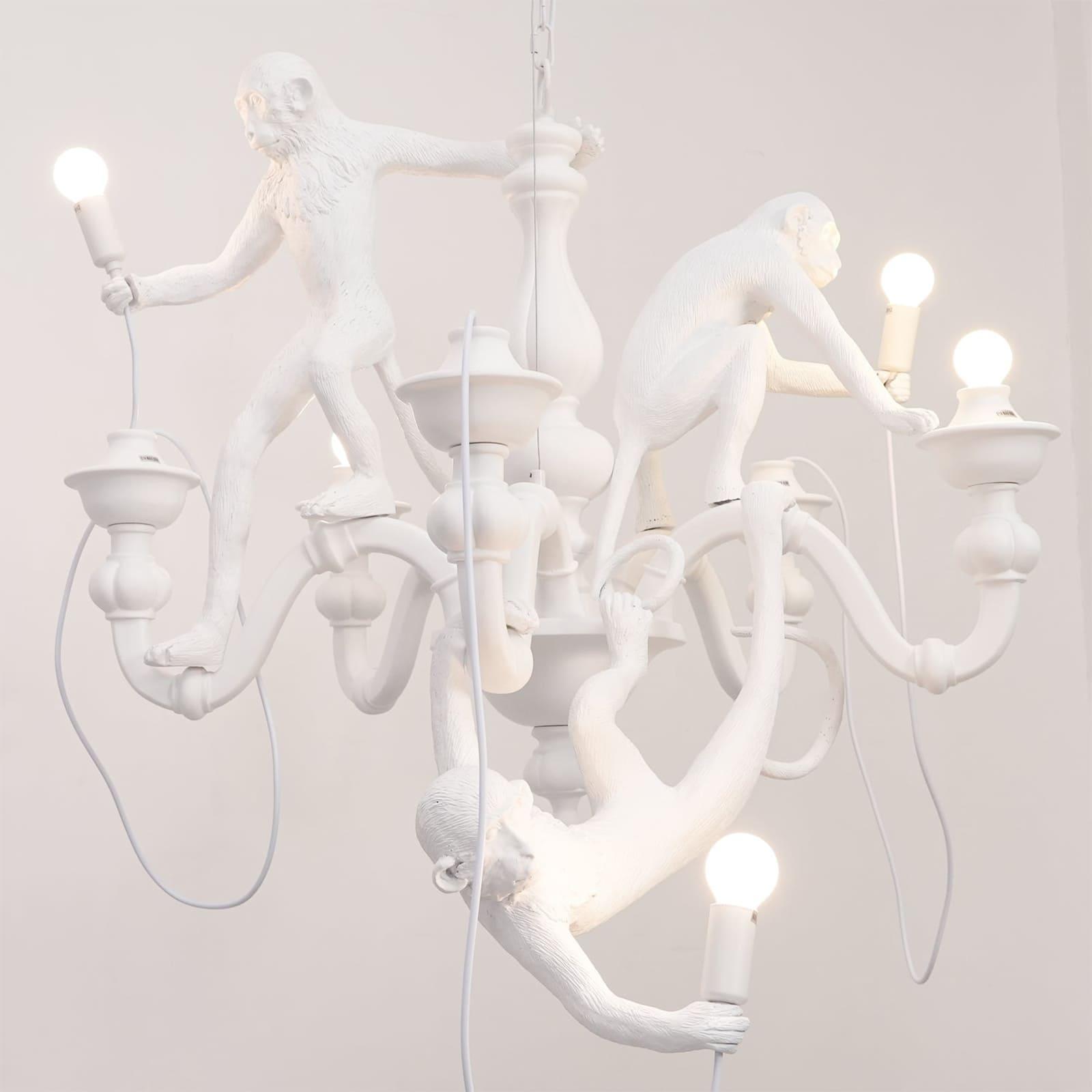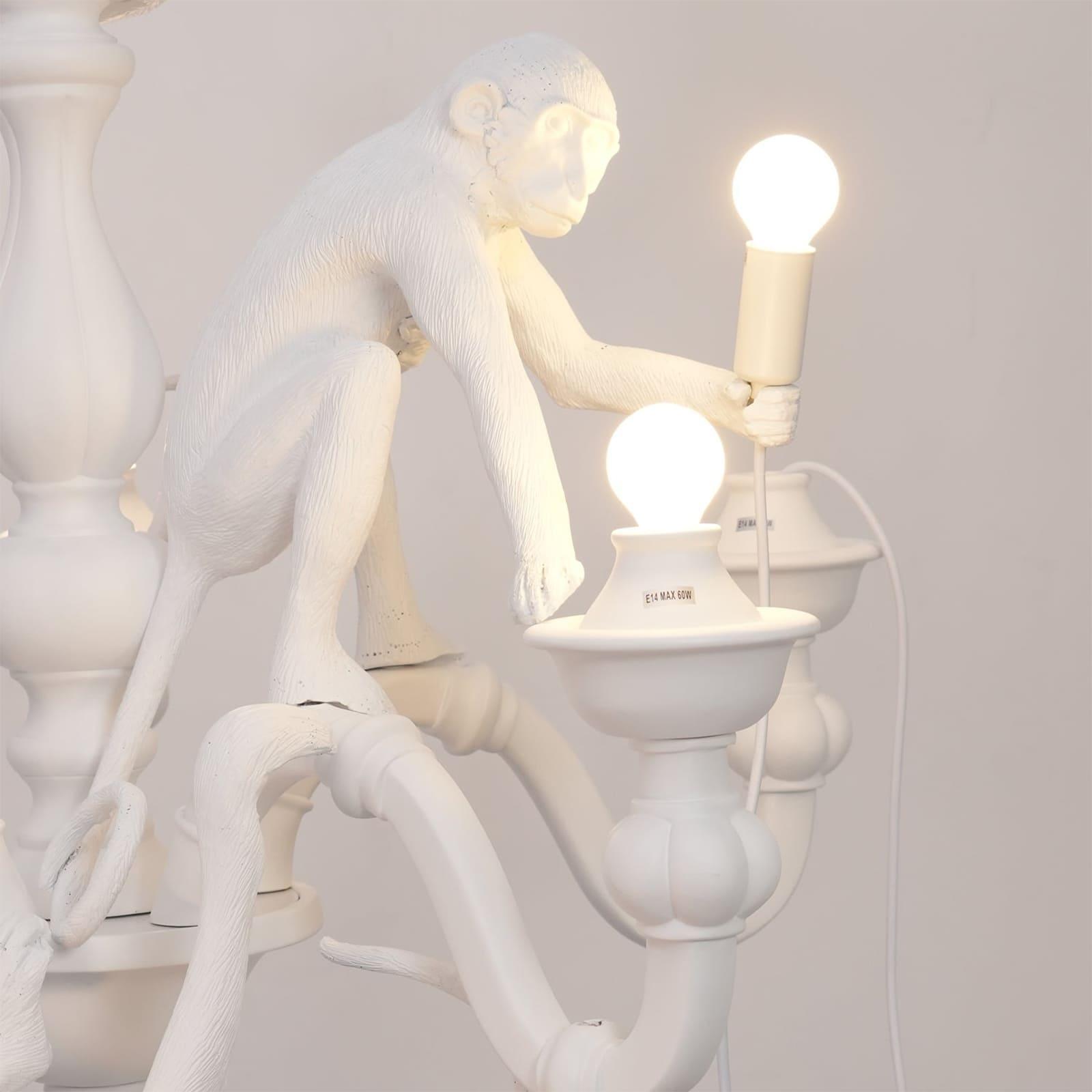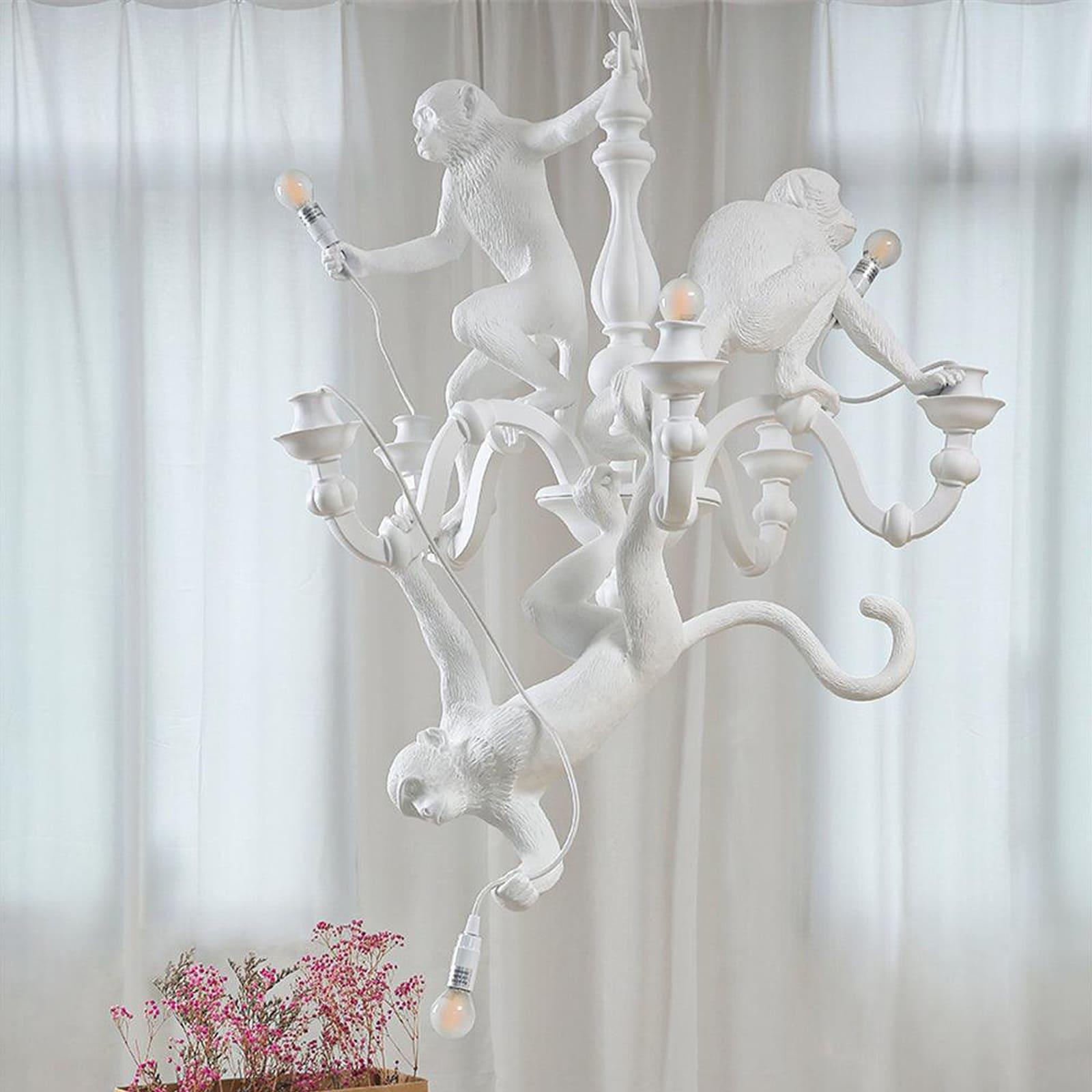 Bring fun and charm to your space with the Monkey Chandelier! Featuring three playful monkeys atop a sleek white chandelier, this whimsical design offers warm, inviting light. Its bold and quirky style makes it a perfect statement piece for any unconventional or playful decor.