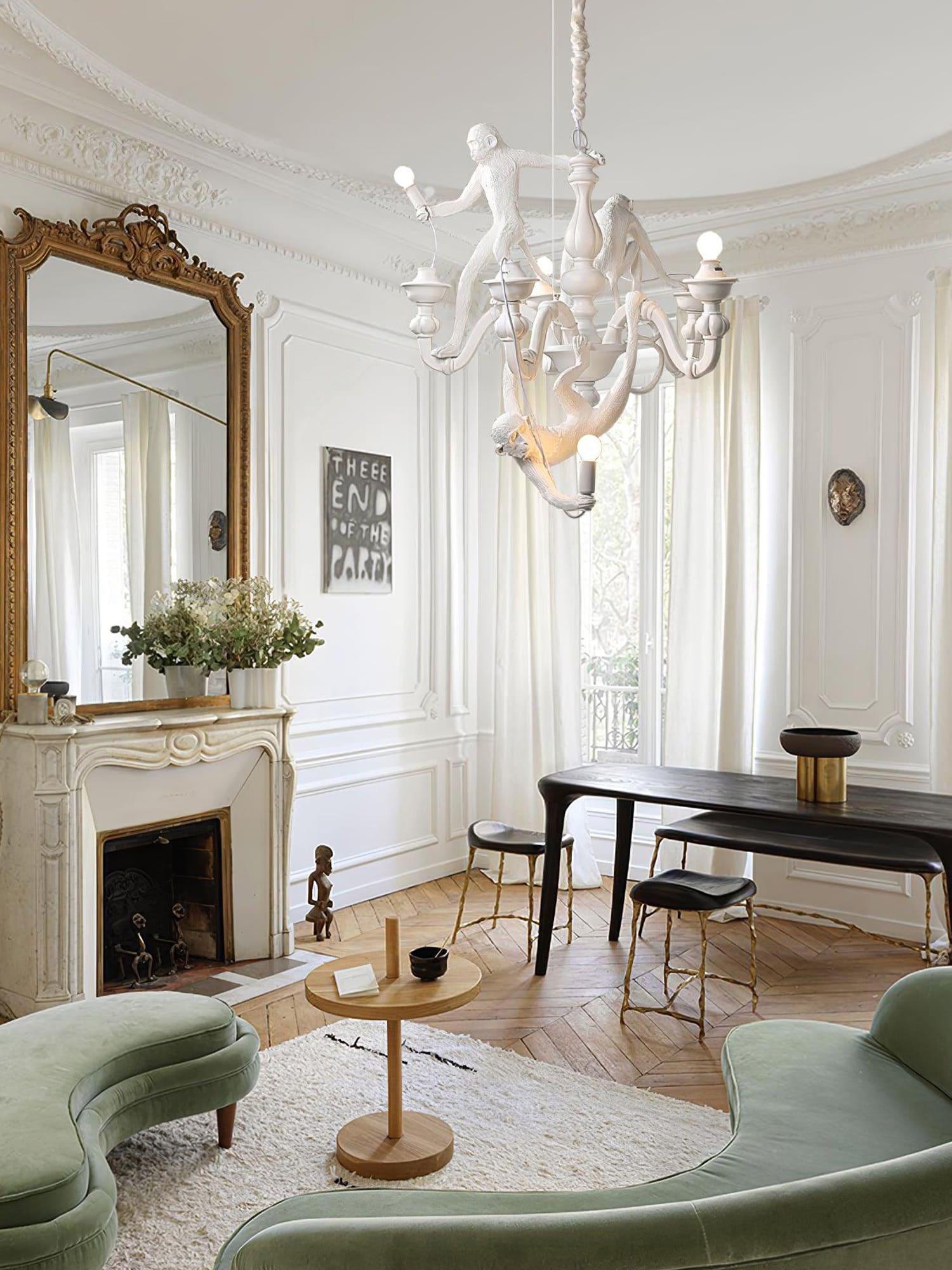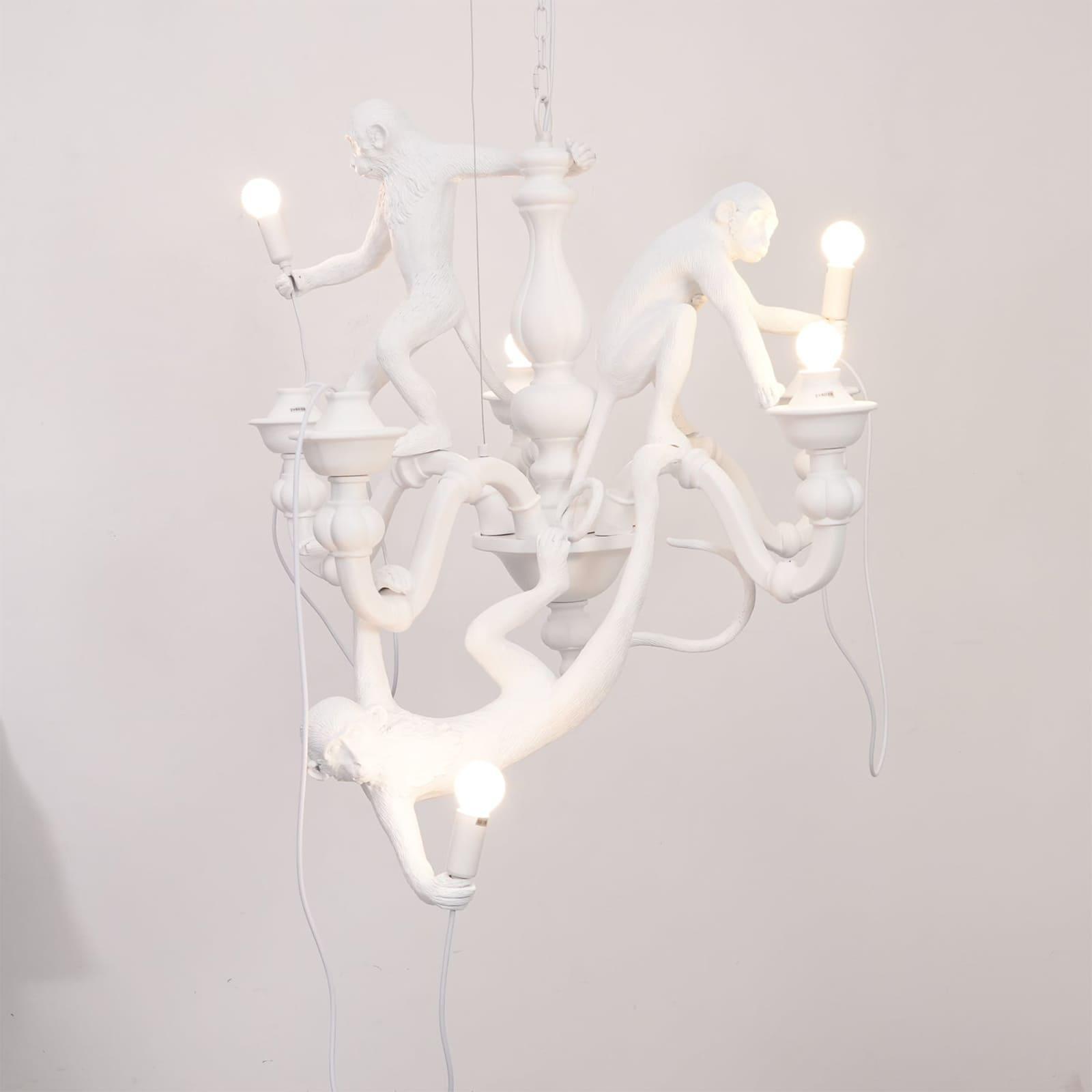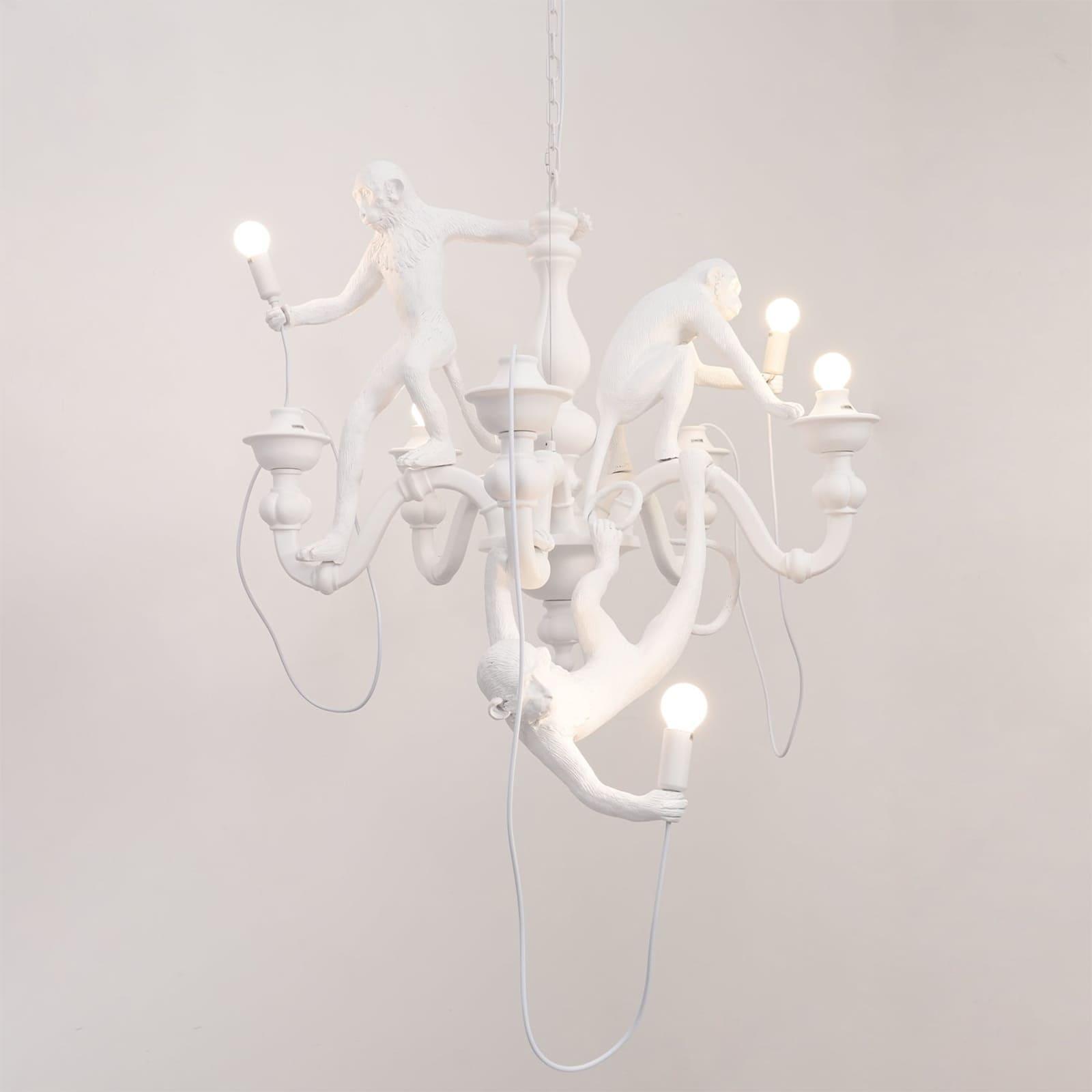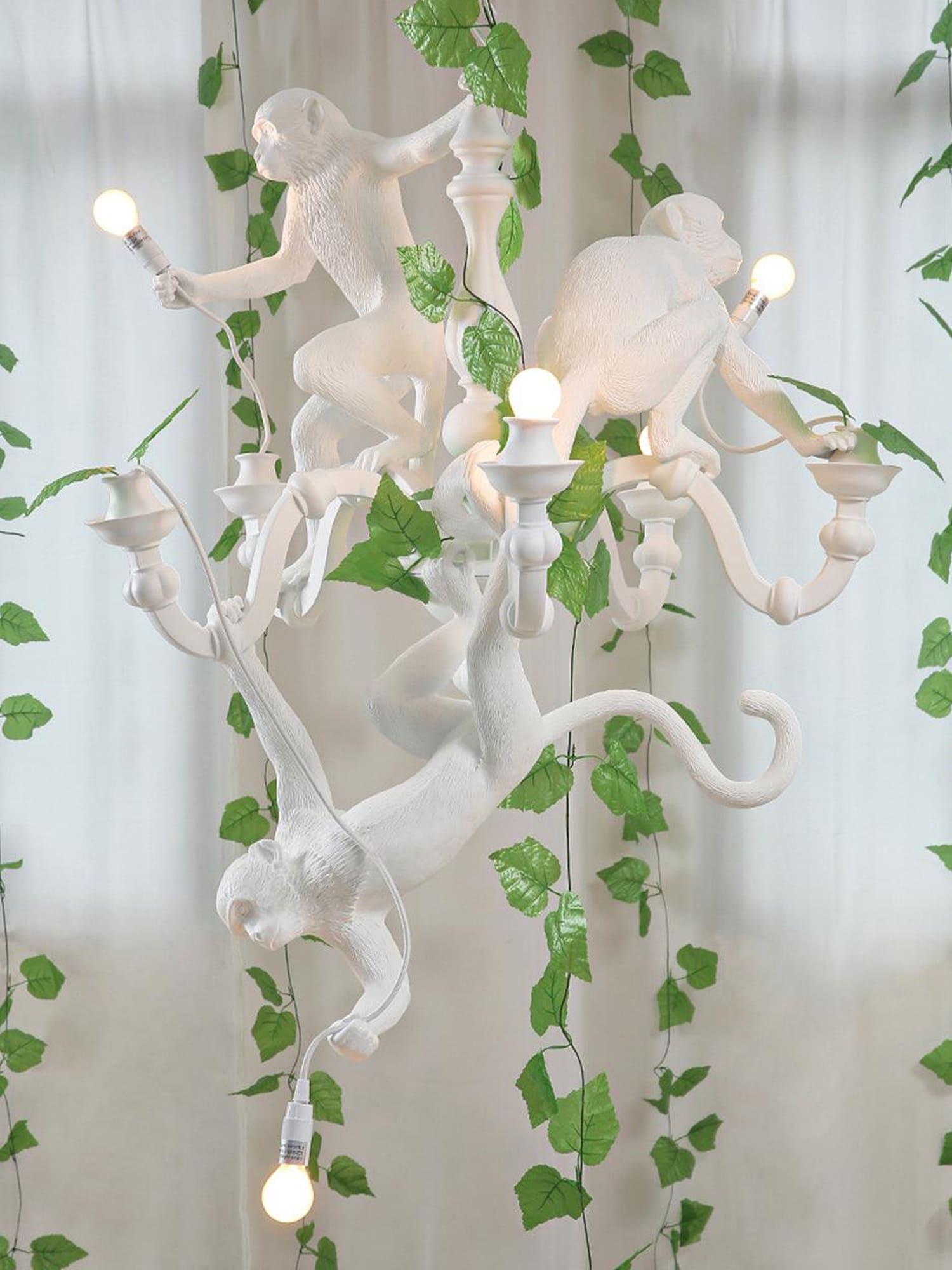Bring fun and charm to your space with the Monkey Chandelier! Featuring three playful monkeys atop a sleek white chandelier, this whimsical design offers warm, inviting light. Its bold and quirky style makes it a perfect statement piece for any unconventional or playful decor.
