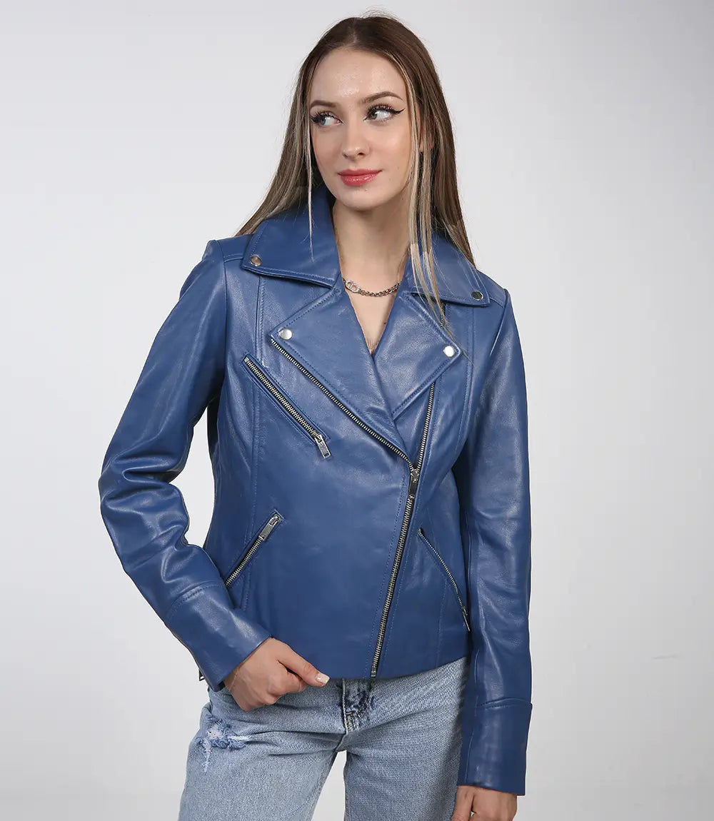 Ninfa Women’s Blue Asymmetrical Biker Leather Jacket