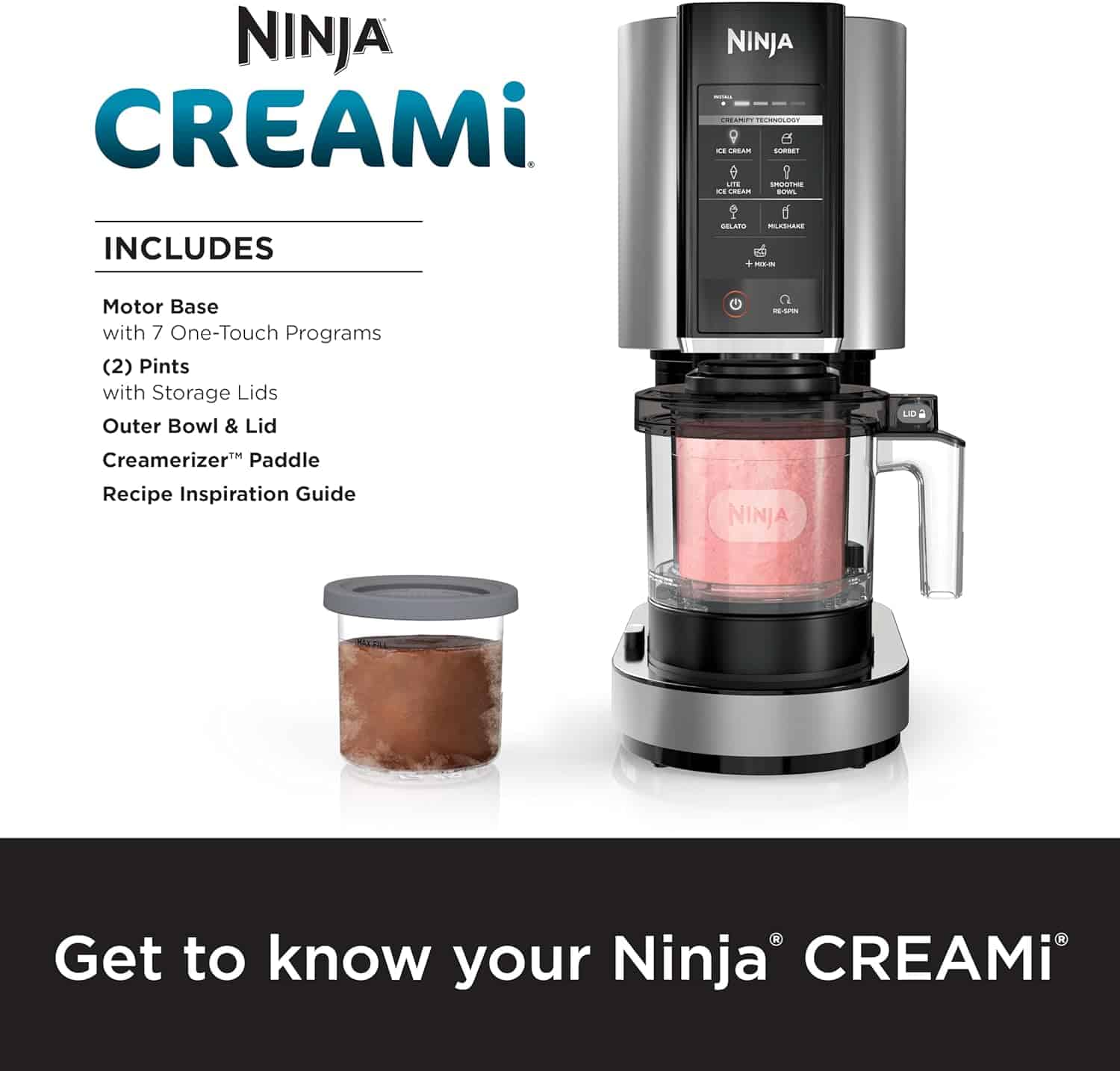 - WHAT’S INCLUDED: Motor Base with 7 One-Touch Programs, (2) 16-oz. Pints with Storage Lids, Creamerizer Paddle, & (1) Outer Bowl and Lid.