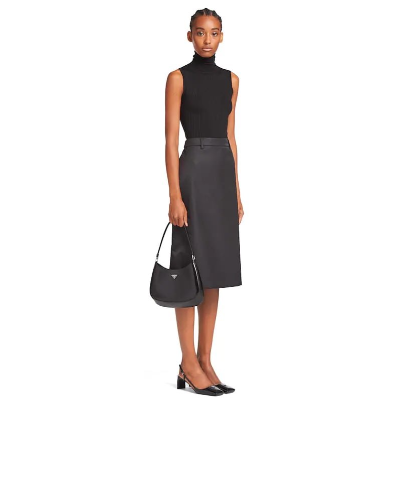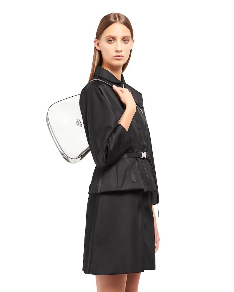 The Prada Cleo bag with sophisticated allure reinterprets an iconic design of the brand from the 1990’s. Sleek curved lines emphasized by the particular construction rounded on the bottom and sides give this hobo bag a soft, light look. Brushed leather, a modern and versatile material that is distinctive in Prada collections, is ideal for creating always new combinations and contrasts. The enamel triangle logo decorates the silhouette.