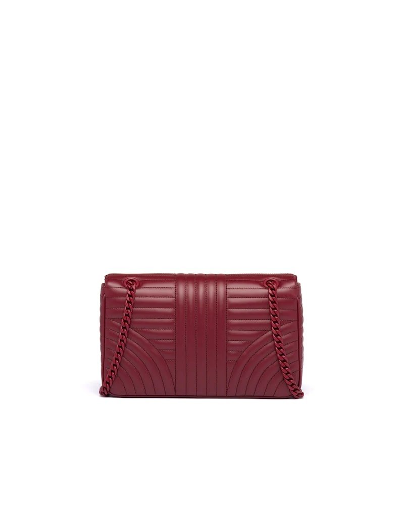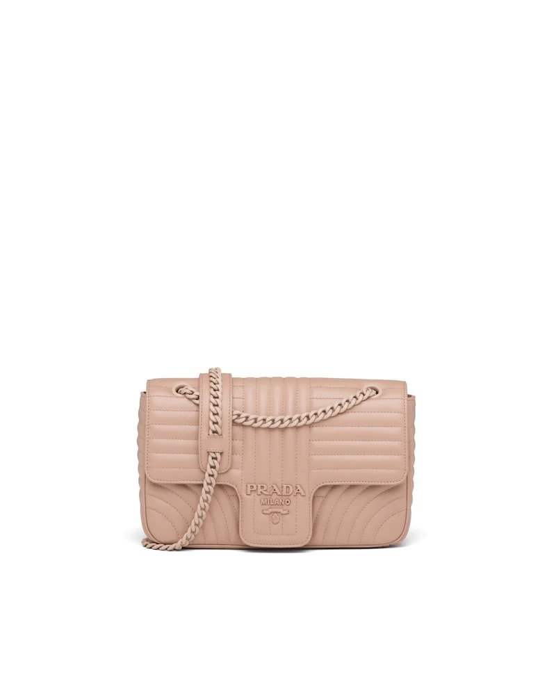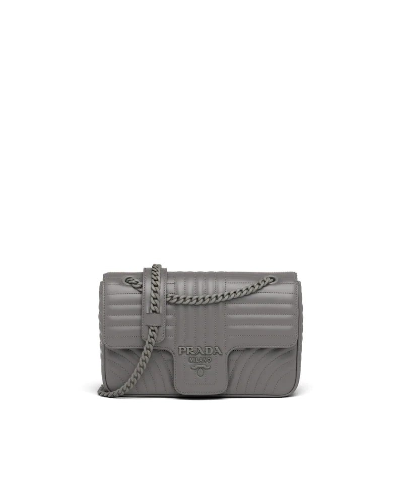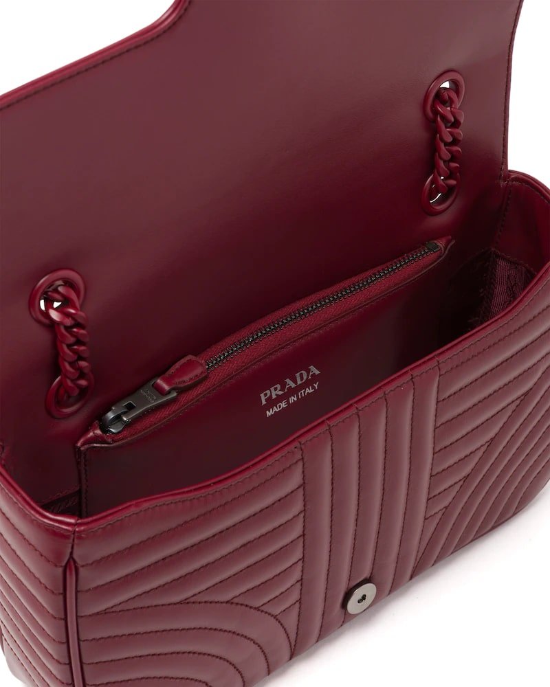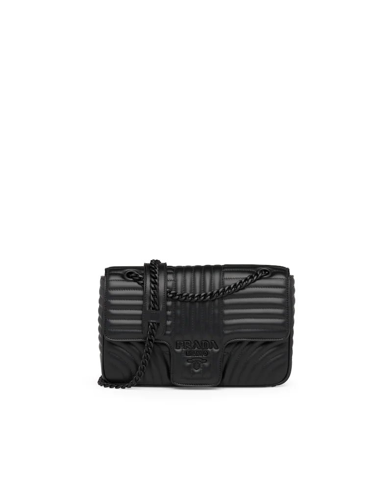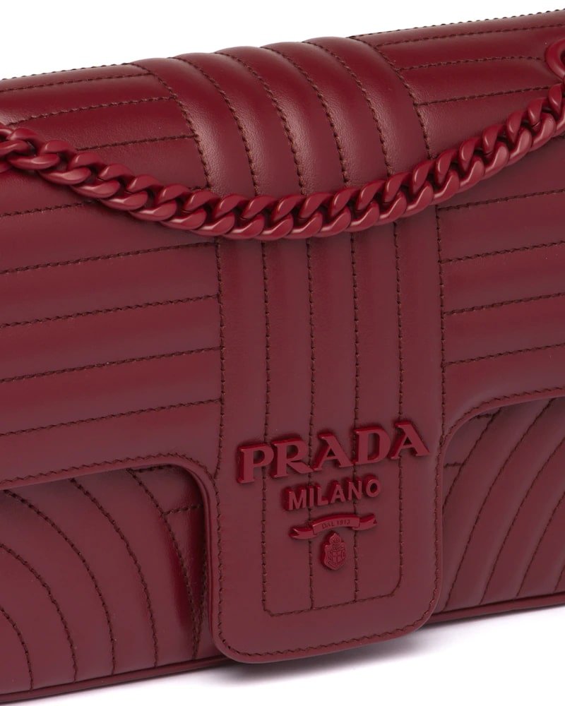 The Prada Diagramme bag, with an elegant stitched motif, has a metal chain shoulder strap with leather shoulder pad. The tonal logo decorates the flap.