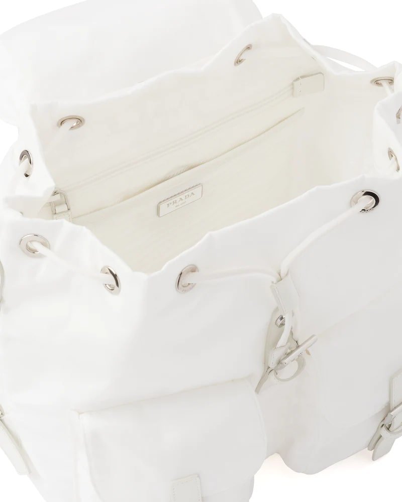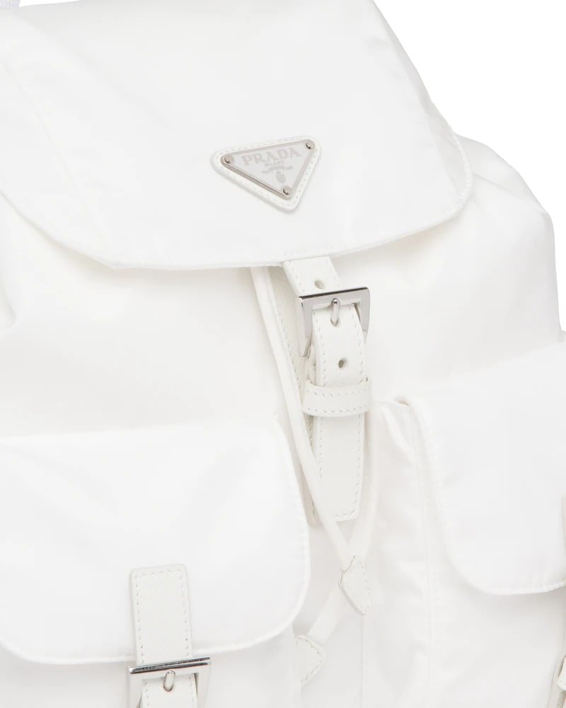 A blend of materials with modern allure and timeless charm are the choice for this iconic backpack of the brand that combines a base made of Re-Nylon, a sustainable evolution of the industrial fabric that is a Prada hallmark, and Saffiano leather details. The enameled metal triangle logo, an historic element reinterpreted each season on designs with contemporary charm, decorates the front.