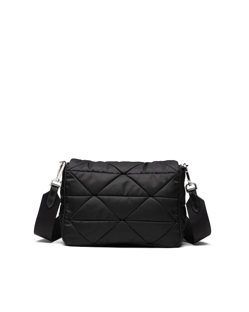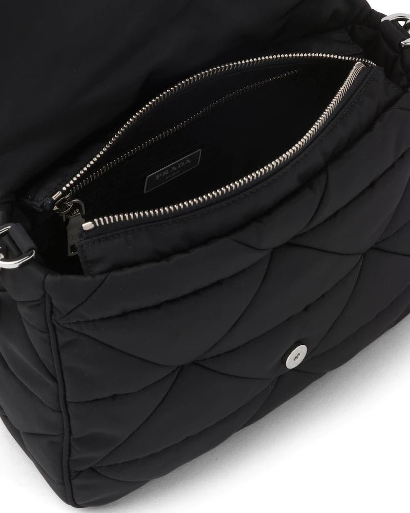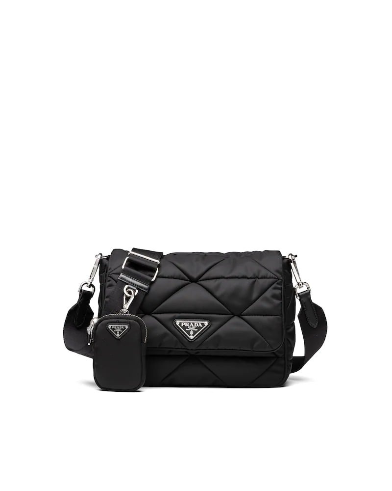 Prada’s iconic triangle logo is reinterpreted in this patchwork motif that accents this hobo bag with soft lines made of Re-Nylon, a regenerated yarn that represents the sustainable evolution of an industrial fabric made iconic by Prada in the eighties. Complete with a mini pouch to attach to the shoulder strap for a contemporary touch, the accessory is embellished on the front with the iconic enameled triangle logo.