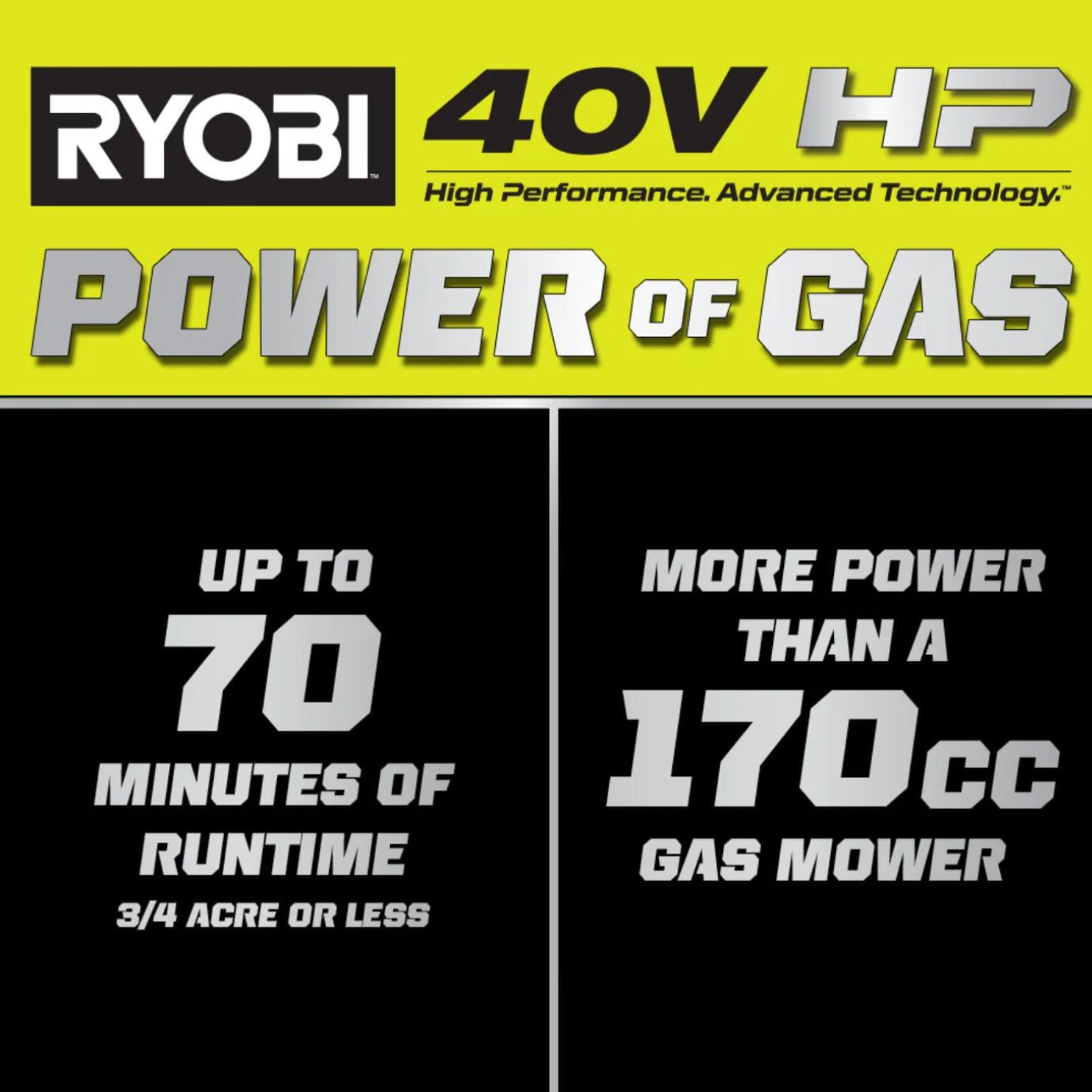The RYOBI 40V HP Brushless 21” Self-Propelled All-Wheel Drive Mower delivers performance that outmatches a traditional 170cc gas mower, offering a true gas replacement experience. Powered by dual active battery ports, this mower is ideal for lawns up to ¾ acre and provides up to 70 minutes of runtime with the included (2) 40V 6Ah batteries.