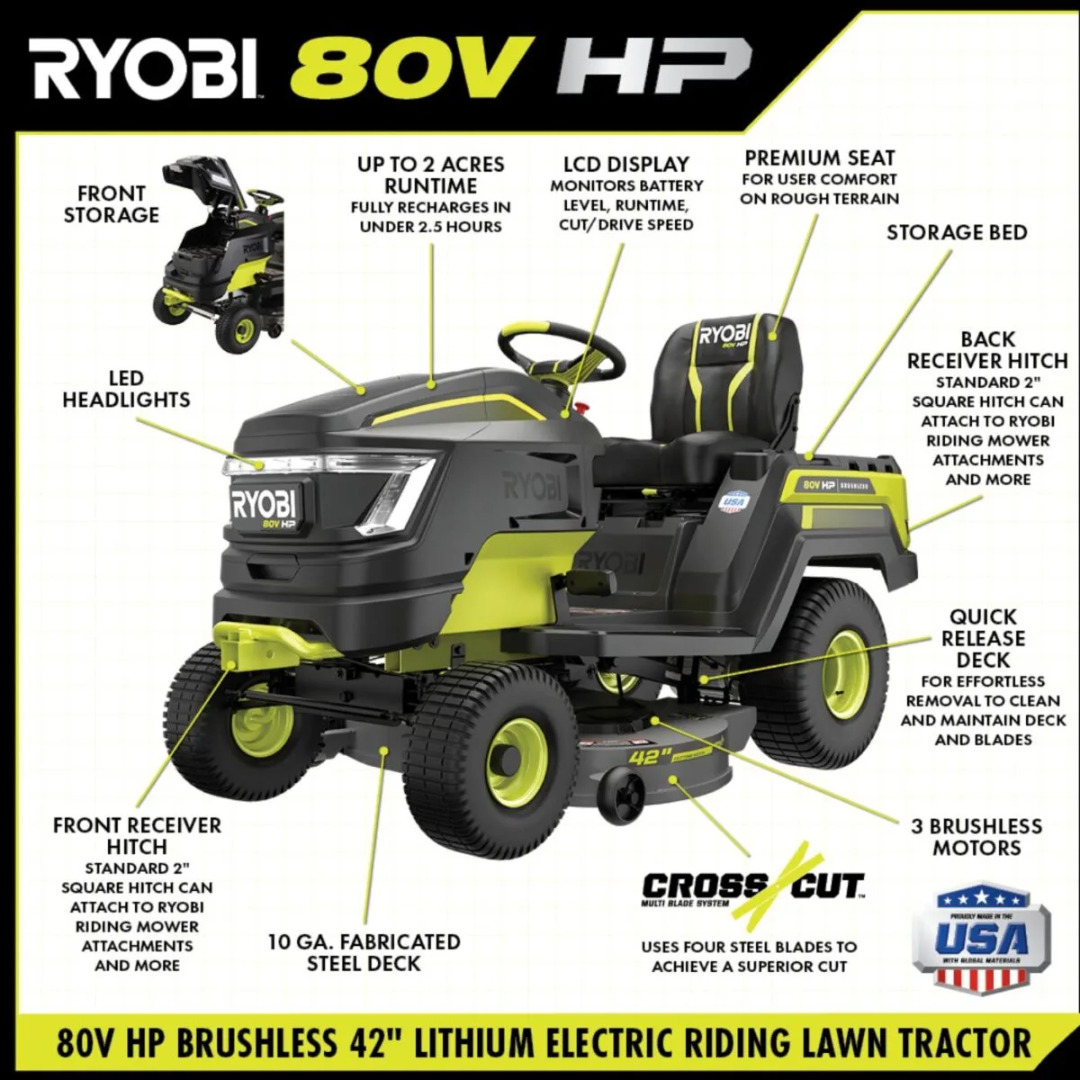 The RYOBI 80V HP 42″ Electric Lawn Tractor is not just a mower—it’s the ultimate outdoor utility vehicle. Quiet, powerful, and packed with features to handle everything from lawn maintenance to light hauling, it’s built for modern homeowners who demand performance and sustainability. Get the job done right—without gas, without compromise.