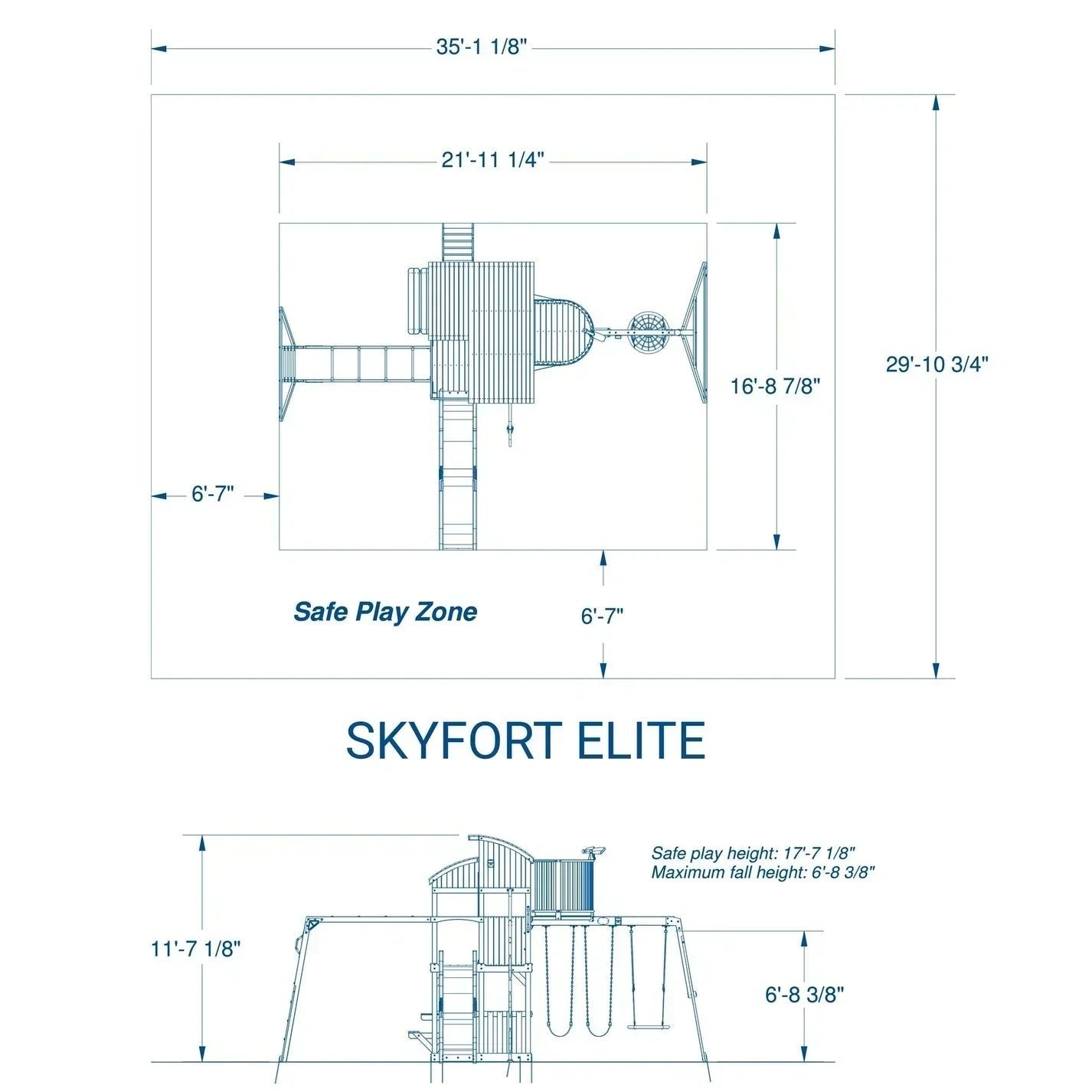 The Skyfort Elite is made from 100% cedar. With small, tight knot structure, your lumber will be less likely to develop small cracks emanating from knots. In laboratory testing, our durable cedar wood proved to be rot resistant and highly resistant to natural decay. All lumber is pre-stained for a smooth and clear appearance, as well as cut and stamped with the swing set parts number to help speed up the building process. Some pilot-hole drilling may be required. Our Safe-T-Fuse hardware makes assembly easy and secure. Its laminated swing beam is built strong, with steel clam-shell brackets to ensure that swinging is always safe.