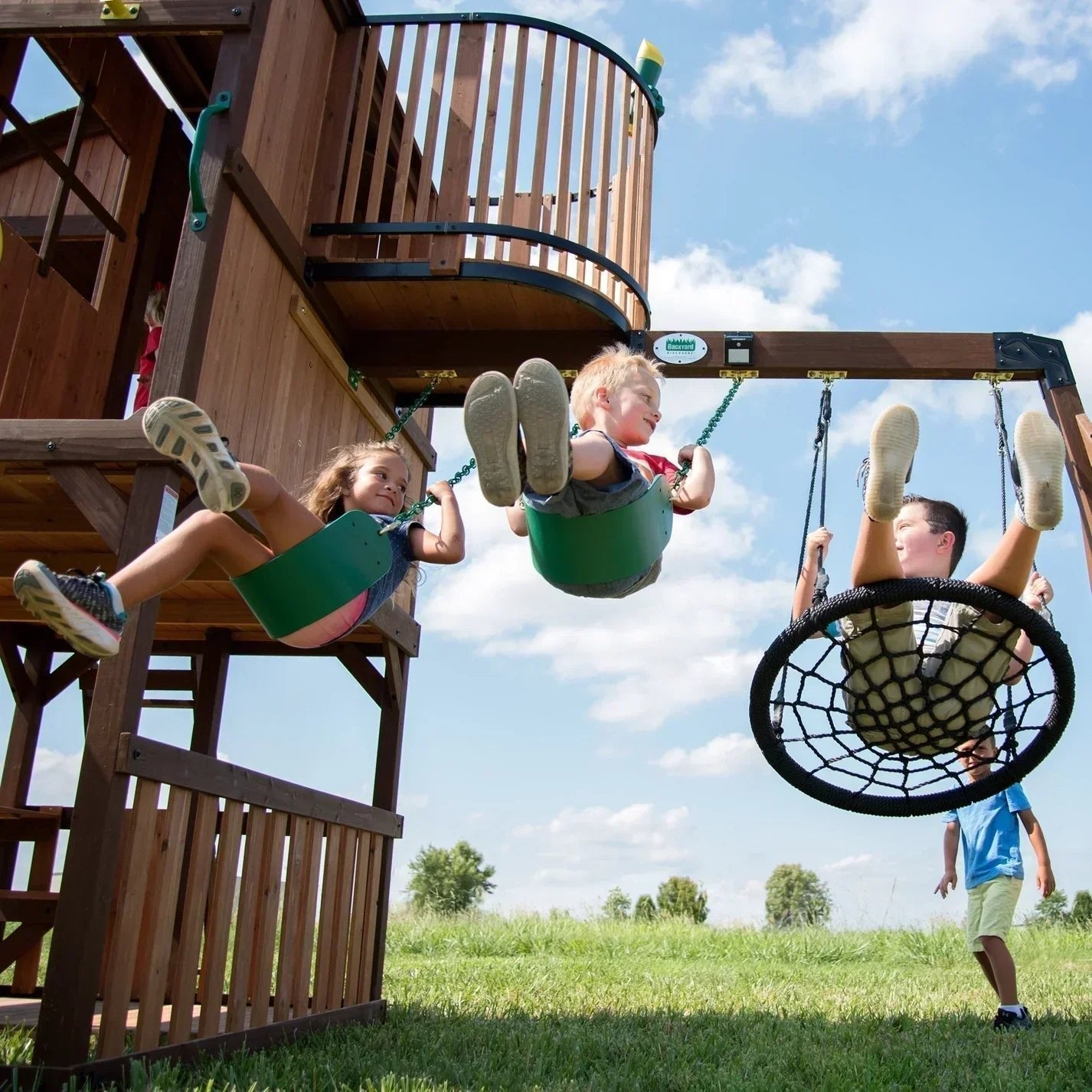 Inspire a whole new level of backyard play fun with the Skyfort Elite swing set by Backyard Discovery. This kids’ outdoor playset allows your little one to have the ultimate fort–right outside your back door. The backyard swing set comes fully loaded with an oversized upper clubhouse, an added crow’s nest and telescope. Kiddos can race up the switchback climbing tree, across the monkey bars, or down the wave speedy play slide. This wooden swing set provides a secret lair beneath the play tower that will keep their imagination soaring all year around.