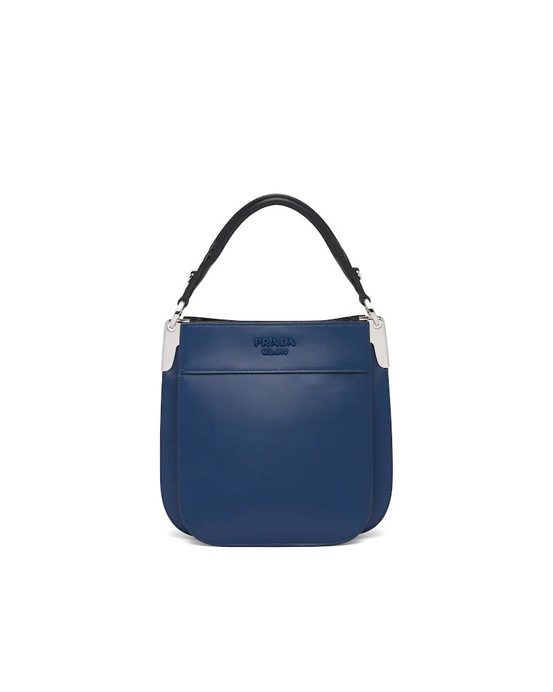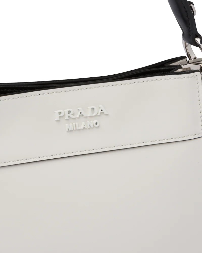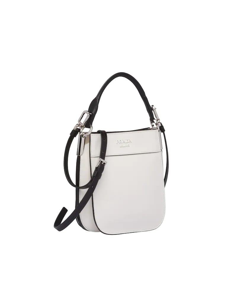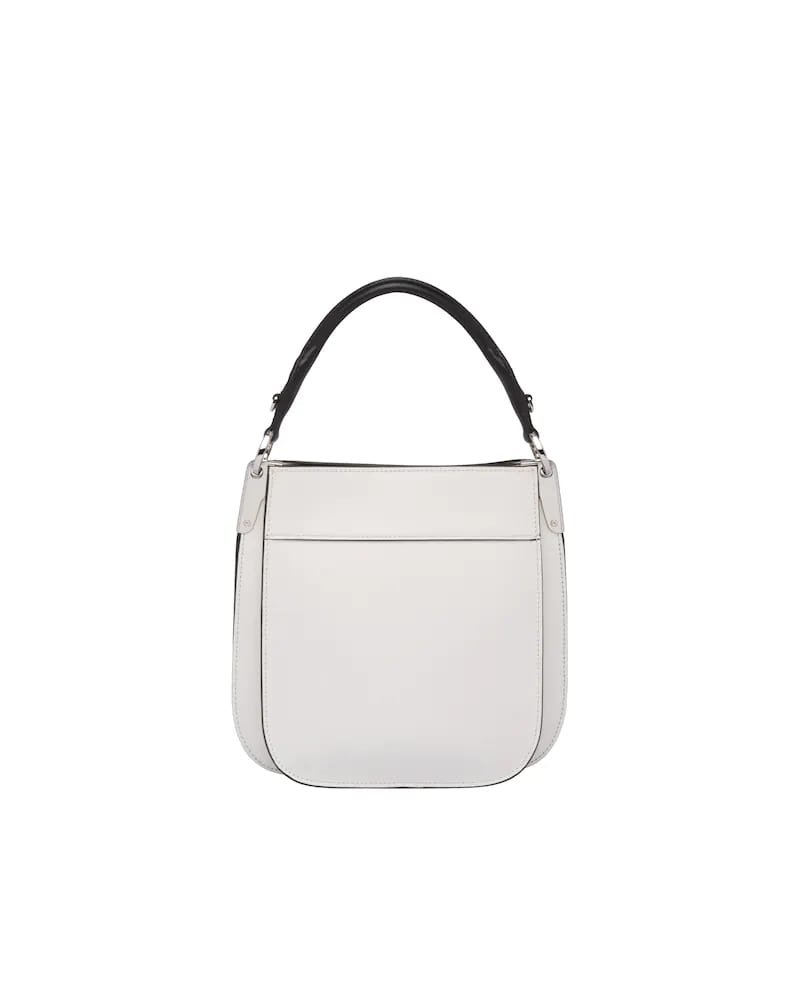 The curvy line of its silhouette distinguishes the Prada Margit handbag. The leather bag has two internal compartments and the metal lettering logo.