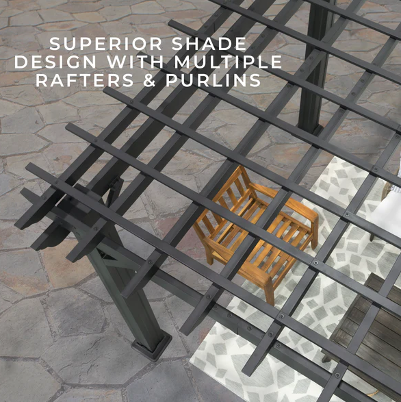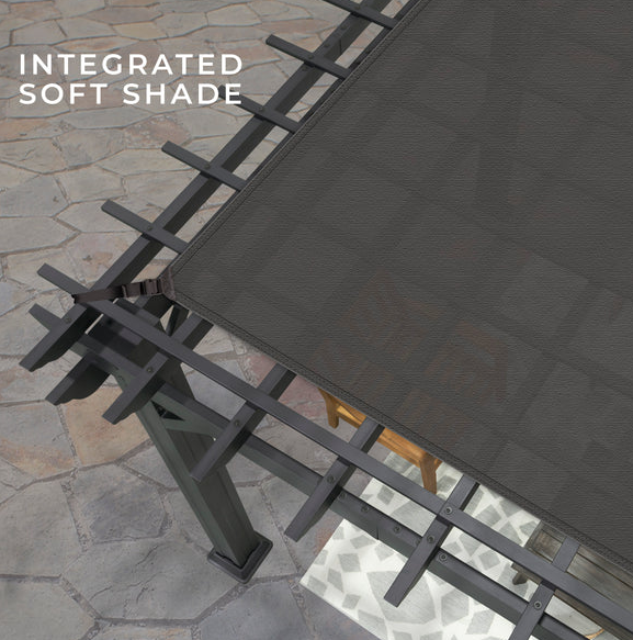 Traditional and timeless, the Stratford Steel Pergola by Backyard Discovery brings effortless charm to your outdoor living area. This stunning patio pergola combines enduring craftsmanship with modern sophistication, featuring a stylish black finish that creates a bold, striking aesthetic. Engineered with powder-coated galvanized steel, it delivers maintenance-free durability while providing superior protection against rust, chipping, corrosion, and UV damage. The elegant design provides plenty of shade with the integrated pergola canopy. This soft shade sail filters sunlight while offering protection from the elements, creating the ideal balance of shelter and ambiance. Pro-Tect™ tested and proven to withstand winds up to 100 mph*, this outdoor metal pergola stands strong through adverse weather conditions. Its generous size provides plenty of room for furniture, fire pits, and outdoor décor to create the perfect space for gatherings or simply relaxing. The patented PowerPort™ features three electrical outlets and three USB ports, making it easy to power your outdoor entertainment needs. This ready-to-assemble backyard pergola kit offers step-by-step guidance with the BILT® app, for easier installation.
