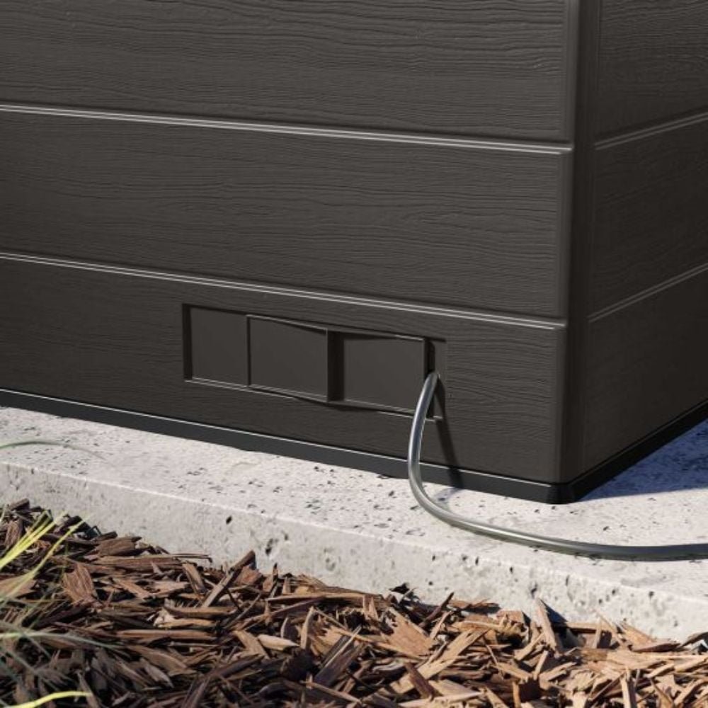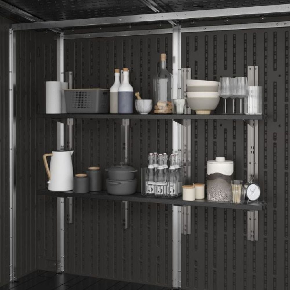 Designed to solve both your outdoor storage and entertaining needs in one ultimate storage solution, the Suncast® 8 x 7 Cabana Entertainment Shed checks all the boxes. This trend-forward design makes an attractive addition to any backyard. With 362 cu. Ft. of storage space, you can maximize your storage capabilities thanks to the included adjustable shelving, baskets, and drawer insert. When it’s time to set up for your next outdoor barbeque or gathering, the Cabana Entertainment Shed effortlessly transitions from a storage shed to a chic entertaining cabana. The sturdy split front panel transforms into a convenient canopy in seconds, providing plenty of shade to get out of the sun. This entertainment shed also includes an integrated bar top that flips down with ease, and provides an ideal spot to pull up a stool for a cool drink or snack with friends and family (barstools not included). Smart inside and out, the Suncast® 8 x 7 Cabana Entertainment Shed is the ultimate storage and entertainment solution.