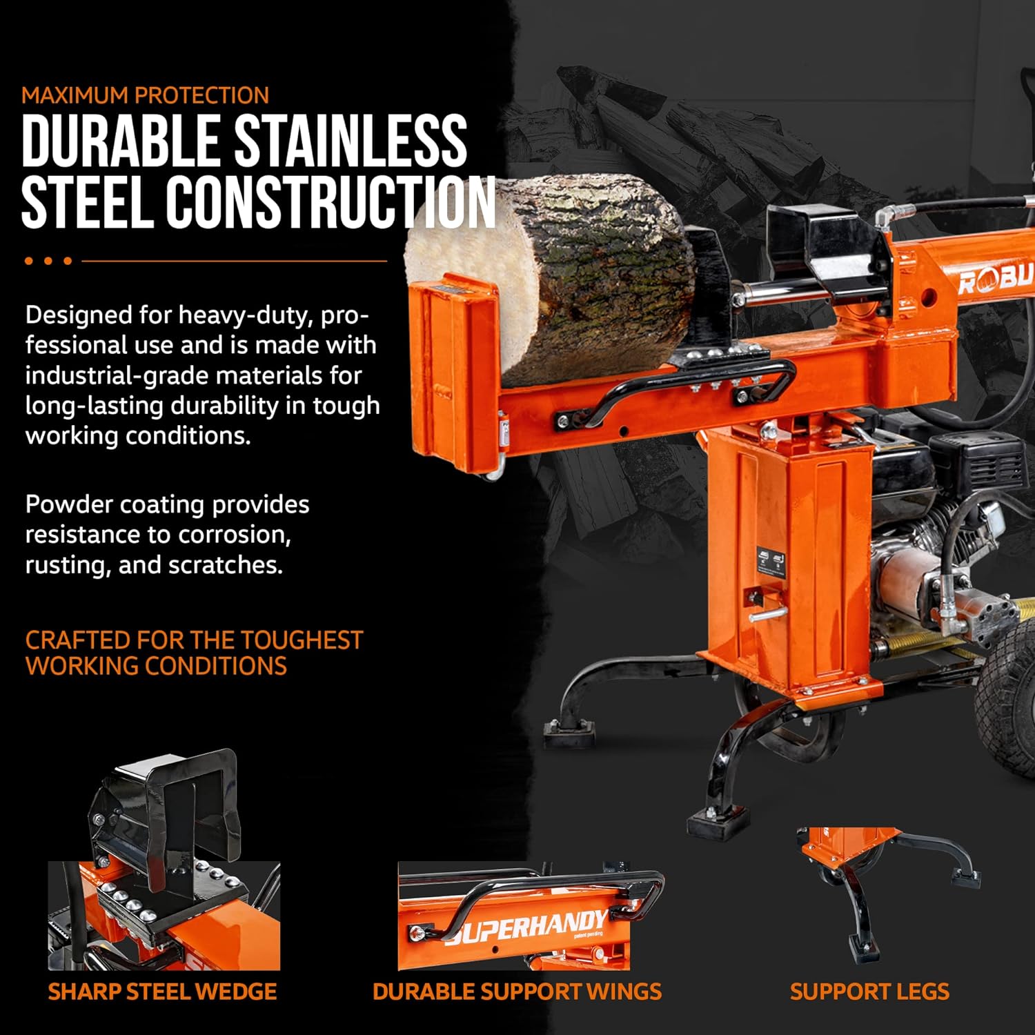 Ability to split logs up to 20 inches in length and 16 inches in diameter for versatile use