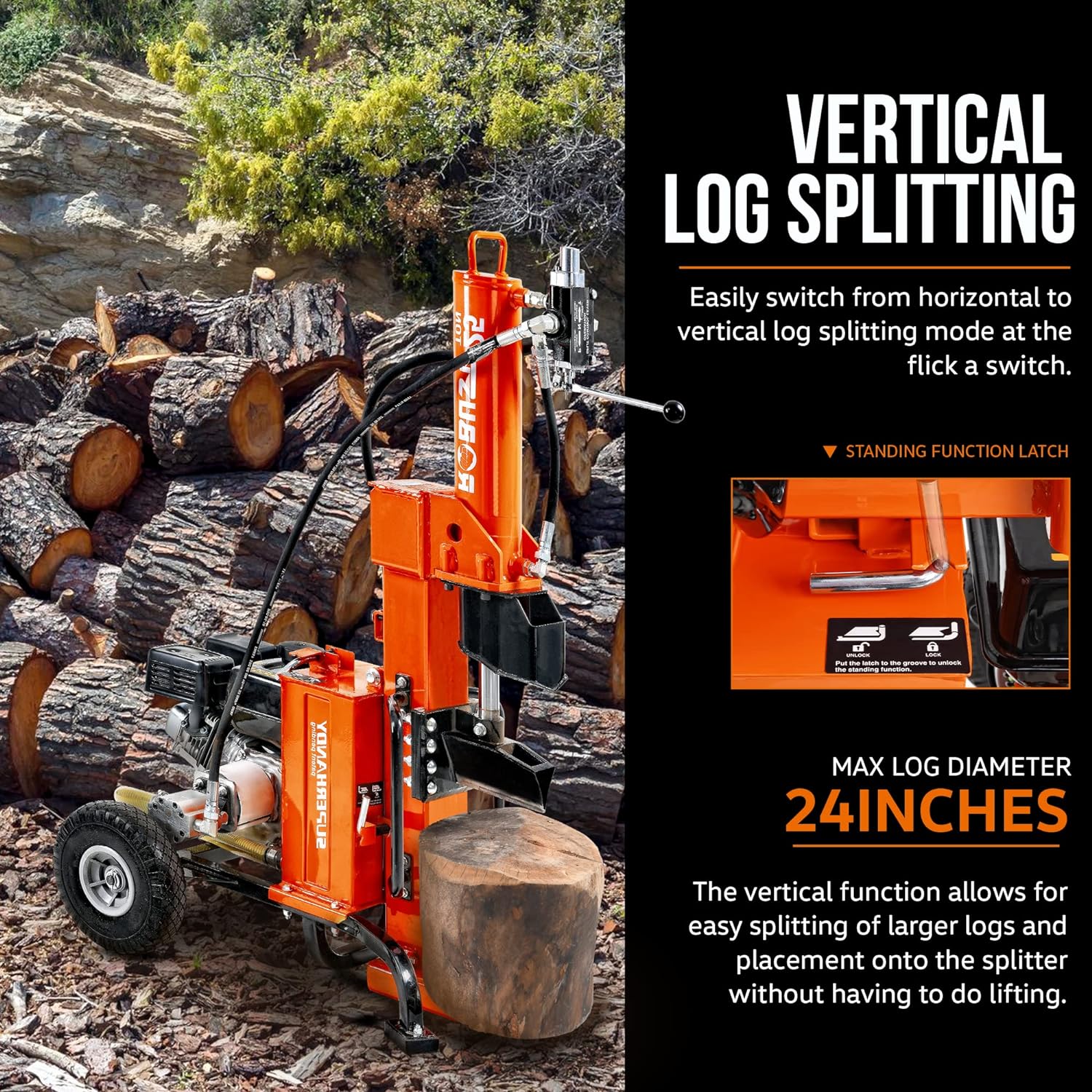 The SuperHandy GUO096 log splitter splits both in either a horizontal or vertical position.Β  Tear through logs up to 20 inches in length and 16 inches in diameter! Get it done twice as fast with our Rapid Auto Return push-rod.