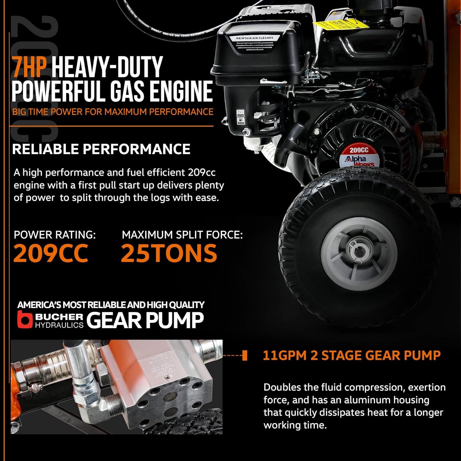 A heavy-duty AlphaWorks 7HP gas engine powers our 25-Ton rated hydraulic system. Utilizes the reliable and trusted 2-Stage Bucher Hydraulic Gear Pump. Our Rapid Auto Return gets you splitting as fast as you can load it. Easily split logs up to 20″ inches in length and up to 16″ inches in diameter