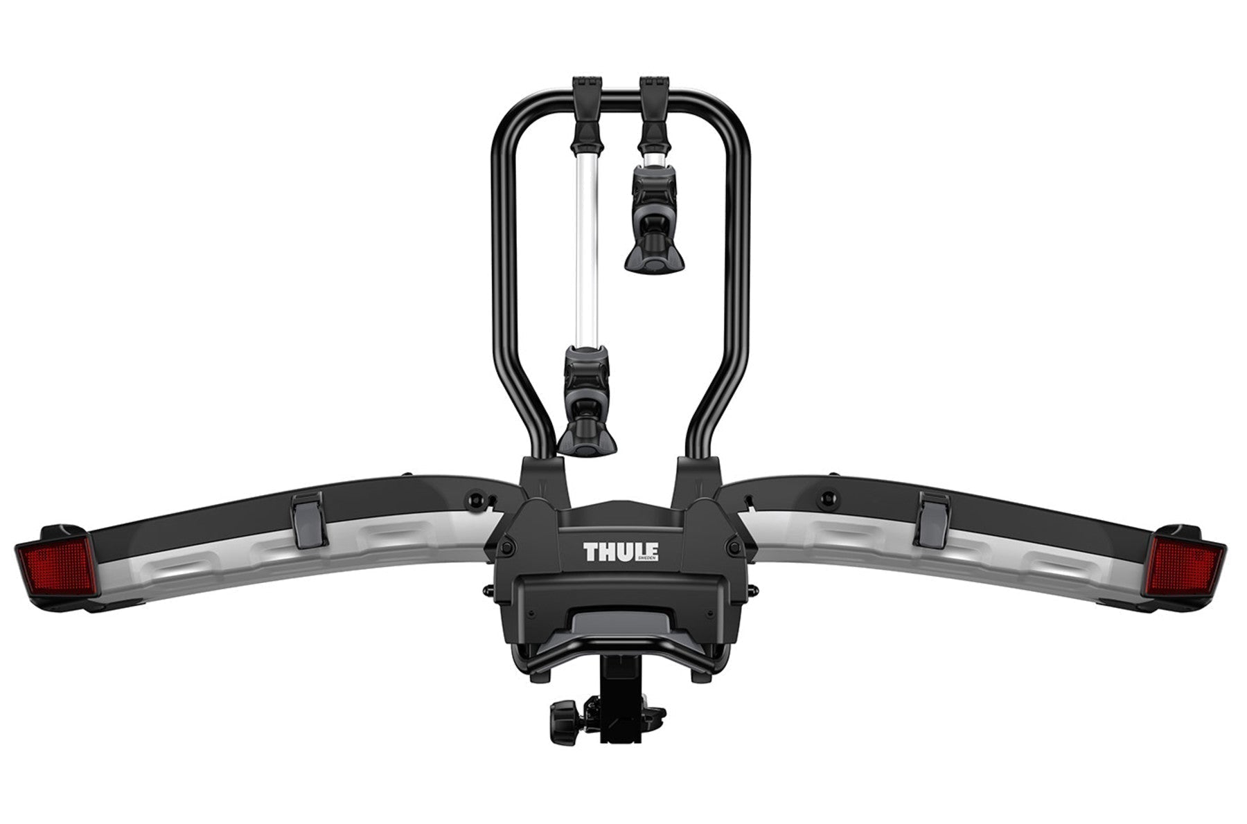 Easy mounting of bikes through detachable bike arms with lockable Thule AcuTight torque limiter knobs that click when optimal torque is reached