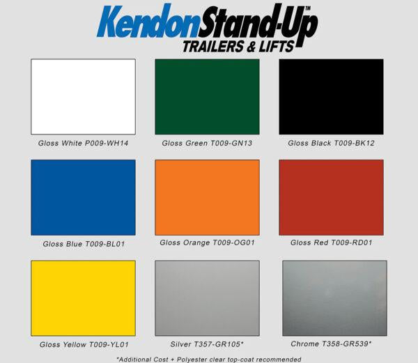 Independent torsion bar suspension Integrated casters for easy maneuverability in storage Lightweight design and construction for simple, one-person operation 13-inch chrome wheels with radial tires Industrial-grade powder coating finish Kendon’s legendary towing performance Made in USA Custom powder coat colors available, call for details 3-year and 5-year Factory Extended Warranty available Please see Additional Info tab for important fit info